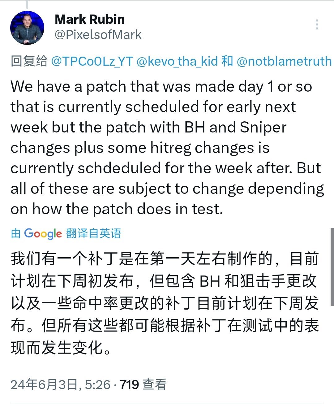 據 Mark 所說,實際上在遊戲正式上線早期就已經完成了一個補丁,而該補丁將在本週(他發文時是他們那邊的週日晚間)發佈。不過有些重要的問題仍需等待,比如狙擊槍的削弱(受擊上抬)和命中反饋 bug(Hitreg)等將會在過後幾周的補丁中得到修復。