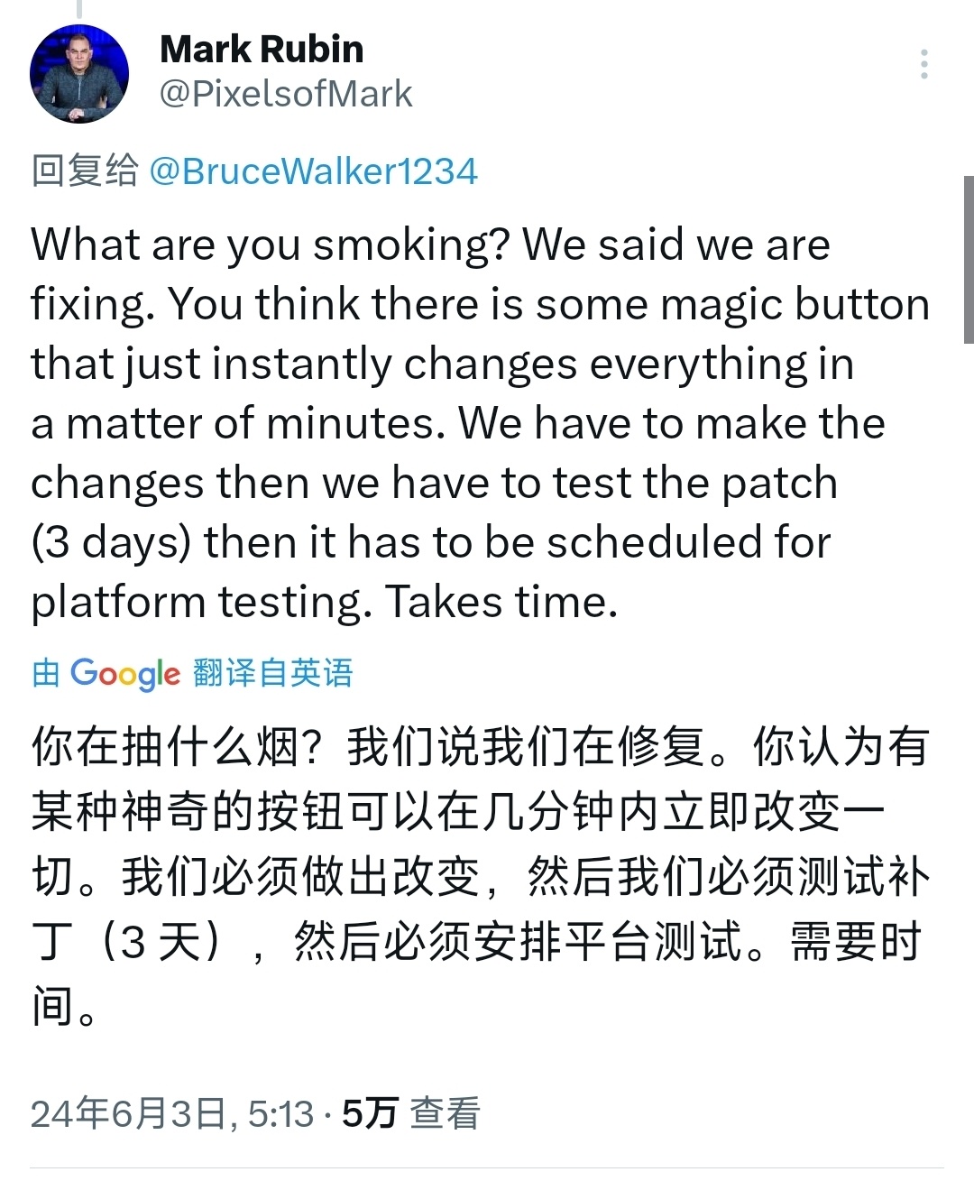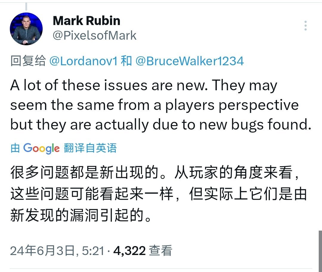 Mark 直接回擊了該網友提出的“開發者無動於衷論”,並且強調了團隊正在對許多 bug 進行修復。只是許多 bug 的調整需要一定時間,再加上補丁製作完畢後也需要一定的時間進行測試,以防止產生更多的 bug,同時需要通過平臺審覈。