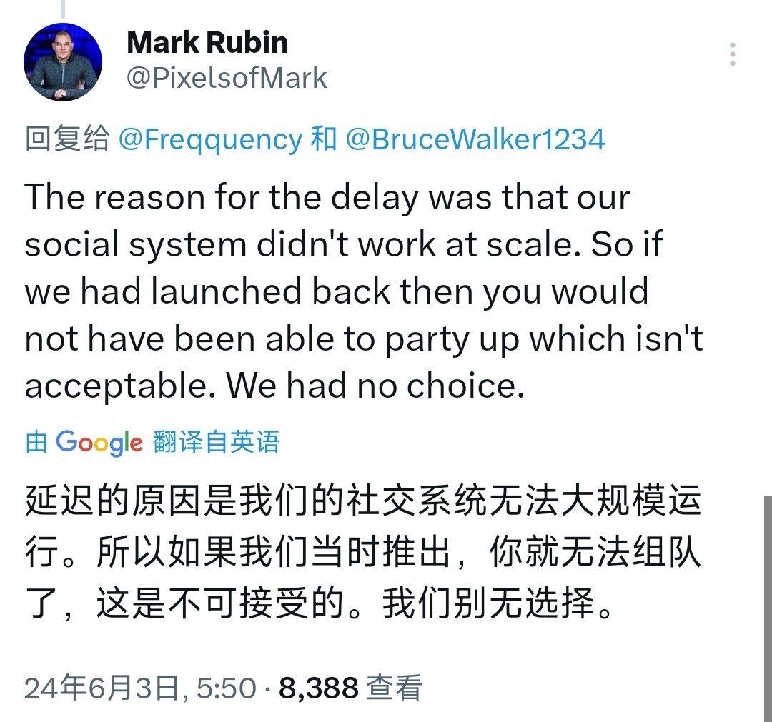 Mark 指出,延遲那麼久的主要原因是因爲遊戲在九個月前的版本中的社交系統很爛,壓根無法支撐起大規模玩家的湧入。它會導致遊戲上線玩家將無法邀請好友組隊遊玩或跨平臺遊玩,而這是開發團隊無法接受的。