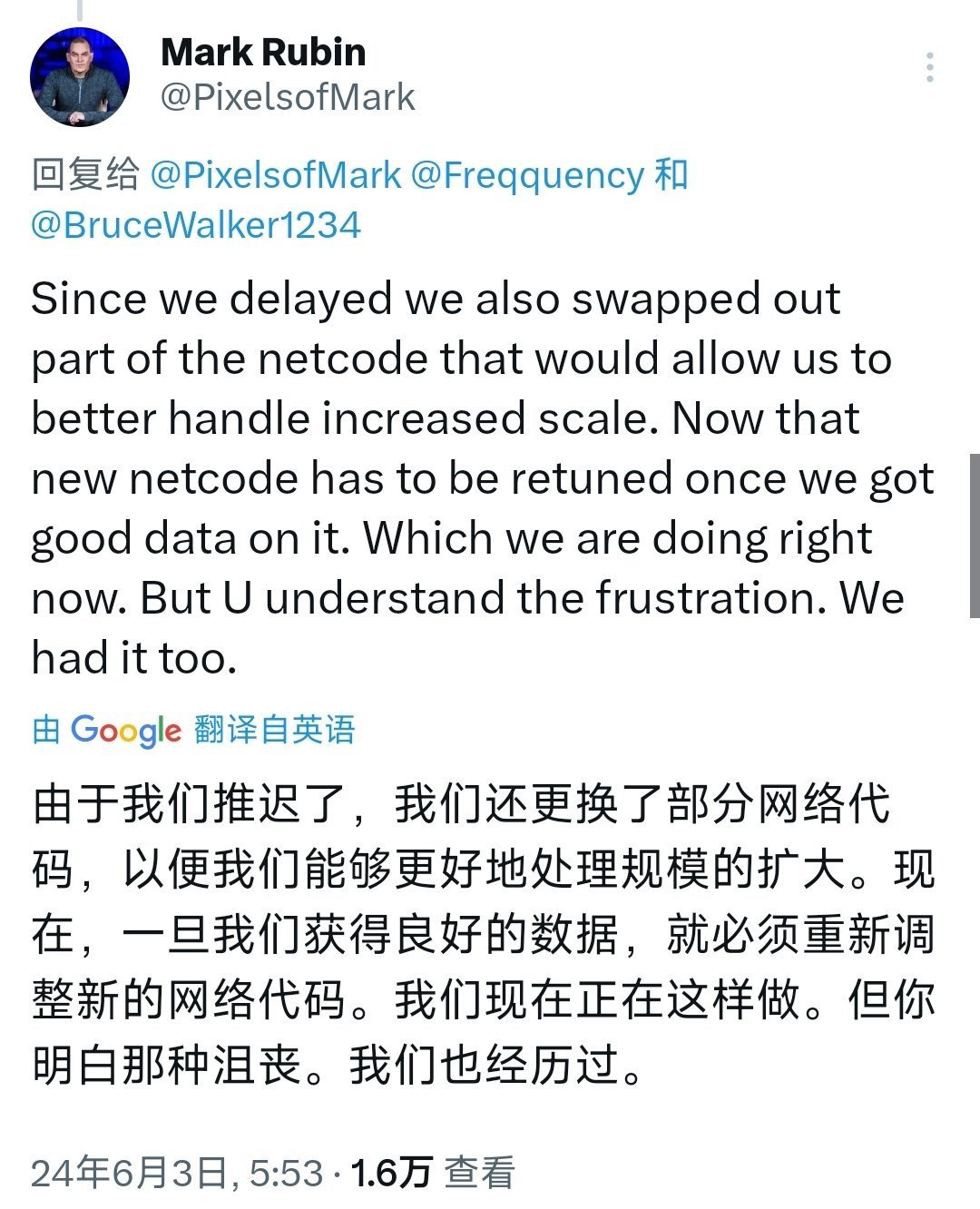 此外,他還補充道,開發團隊更換、重做了一部分的網絡代碼,但是重做完的網絡代碼也絕非完美,它相當於一個雛形,仍需要大量的實際數據才能優化。只有當開發團隊得到了足夠多的玩家數據後,才能針對性地對網絡代碼進行修復和更正,這是令人沮喪的,但確實無法避免。