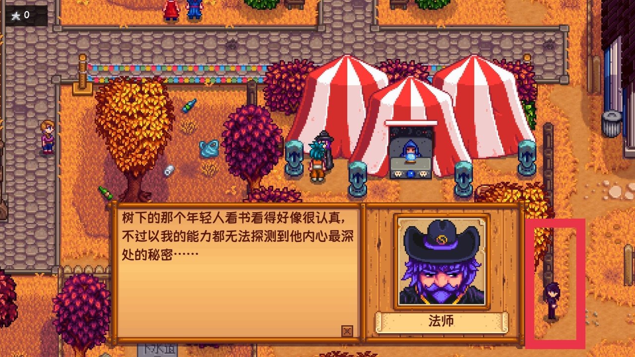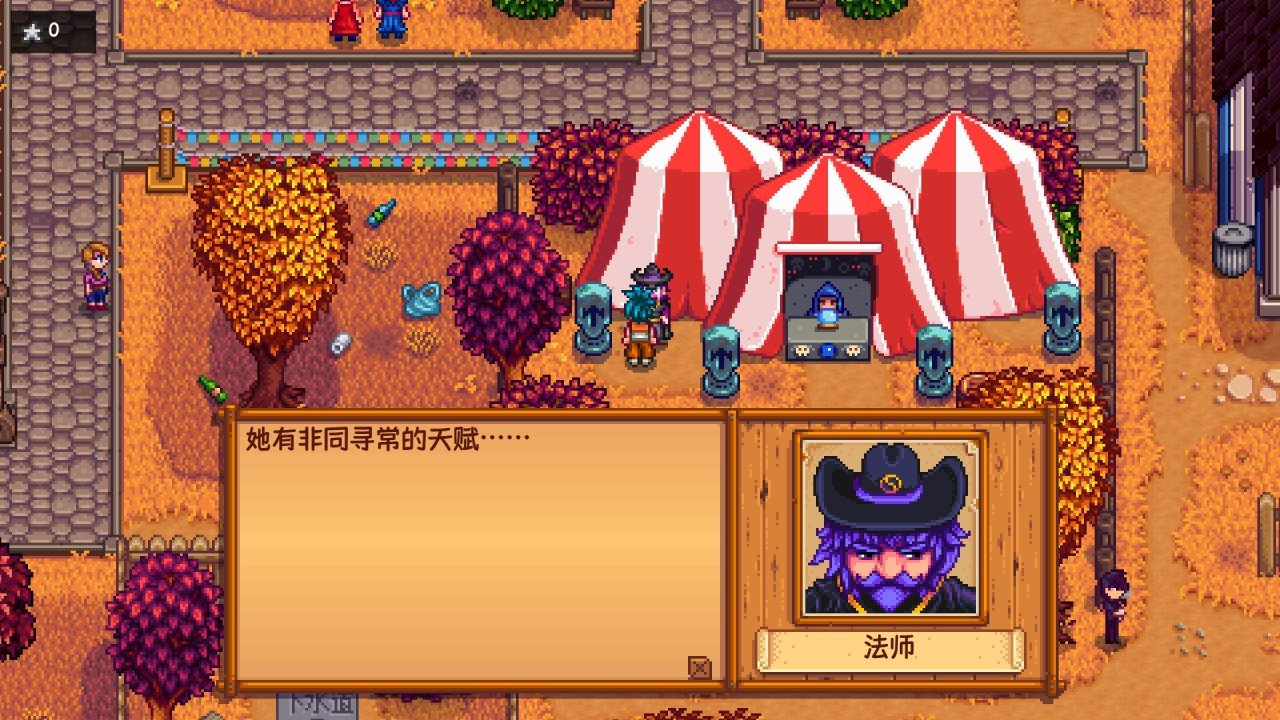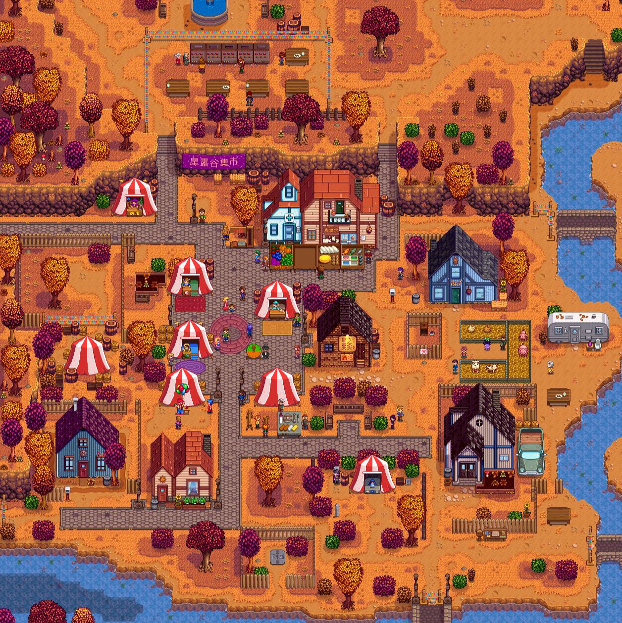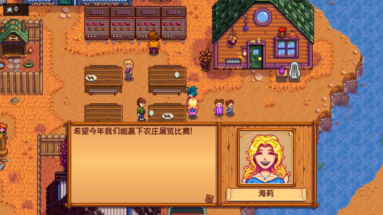 星露谷展览会是游戏中的一个节日,于每年秋季16日的早上9.—下午3.之间举办,我们只要在这期间进入鹈鹕镇就能参加了,不管大家从哪里进入小镇(下水道,山区,矿车,煤矿森林,海滩),最后出现的地方都只会在从公交车站进入小镇的那个位置,我们在早上9.之前是不能进入小镇的,当我们进入节日场景后,时间就会一直静止,只要我们不离开节日场景,节日就一直不会结束,当我们离开节日场景后,节日会马上结束,我们会被传送到家门口,时间变成晚上10.