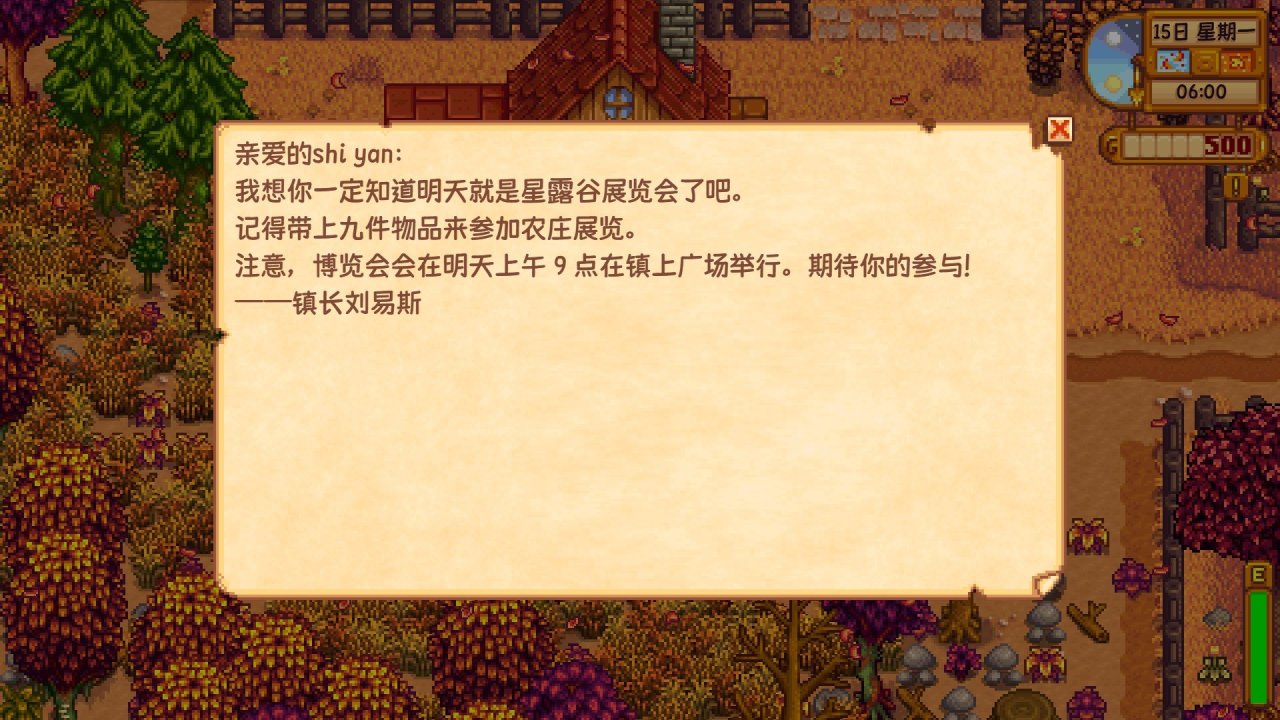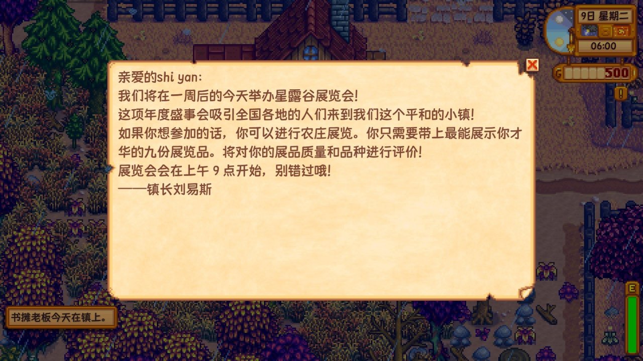 在秋季的第9日,也就是节日开启前的一个星期,刘易斯会寄信给我们,提醒我们下周就是星露谷展览会了,让我们带上九件展览品进行农庄展览,并告诉我们展览会会在早上9.开启