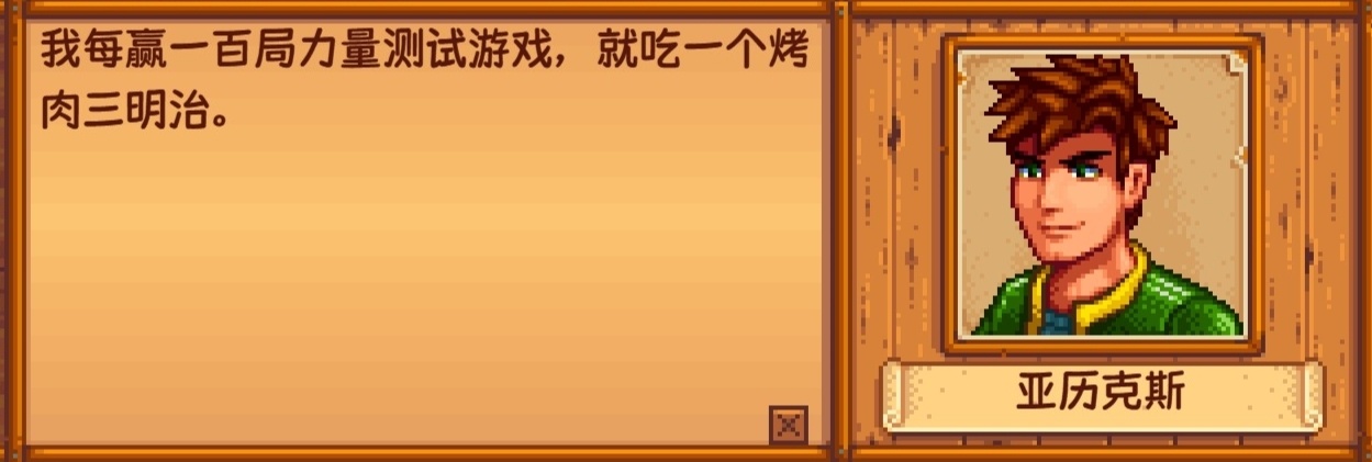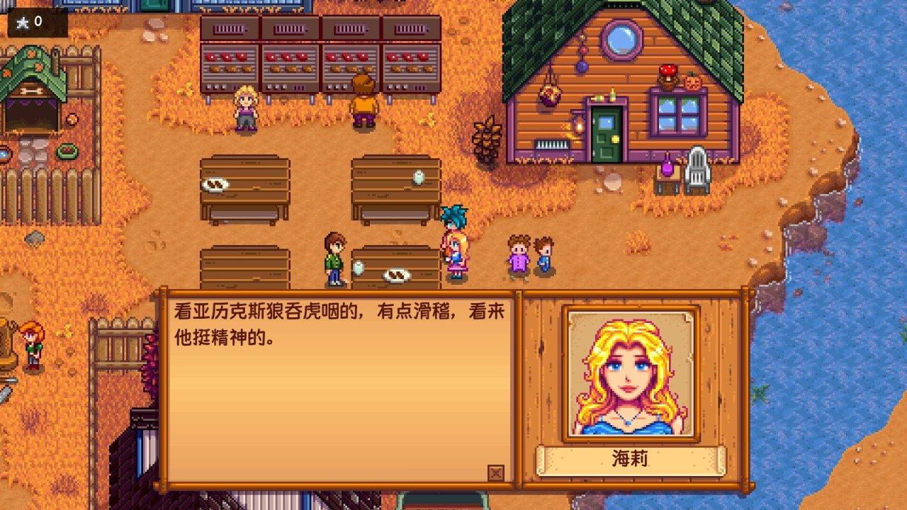 在该节日时找海莉互动,她也一样会触发特殊对话,我这里是偶数年,但奇数年和偶数年的对话应该大差不差的(我觉得有人看到这又要说绿帽谷了,但我在以前发过一篇文章,其实当你和海莉结婚后亚历克斯已经释怀了,而且亚历克斯和海莉在小镇上都是互相唯一的朋友,节日聚一聚挺正常的,结婚后的海莉除了节日压根都不会去找亚历克斯)
