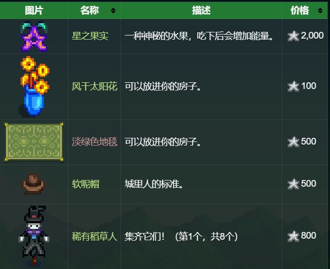 最后推荐必换的三种物品:星之果实(永久增加体力值上限34点)、珍奇乌鸦(就是稀有稻草人的其中之一,集齐所有稀有稻草人可获得一个配方)、辉石戒指(提供固定光源和增加物品的收集范围,前中期都很好用),以上三种物品我推荐碰到的话都换,每样换一个就行了,星星币不难获取,有时间的话还可以把所有商店库存都清空,不要白不要嘛