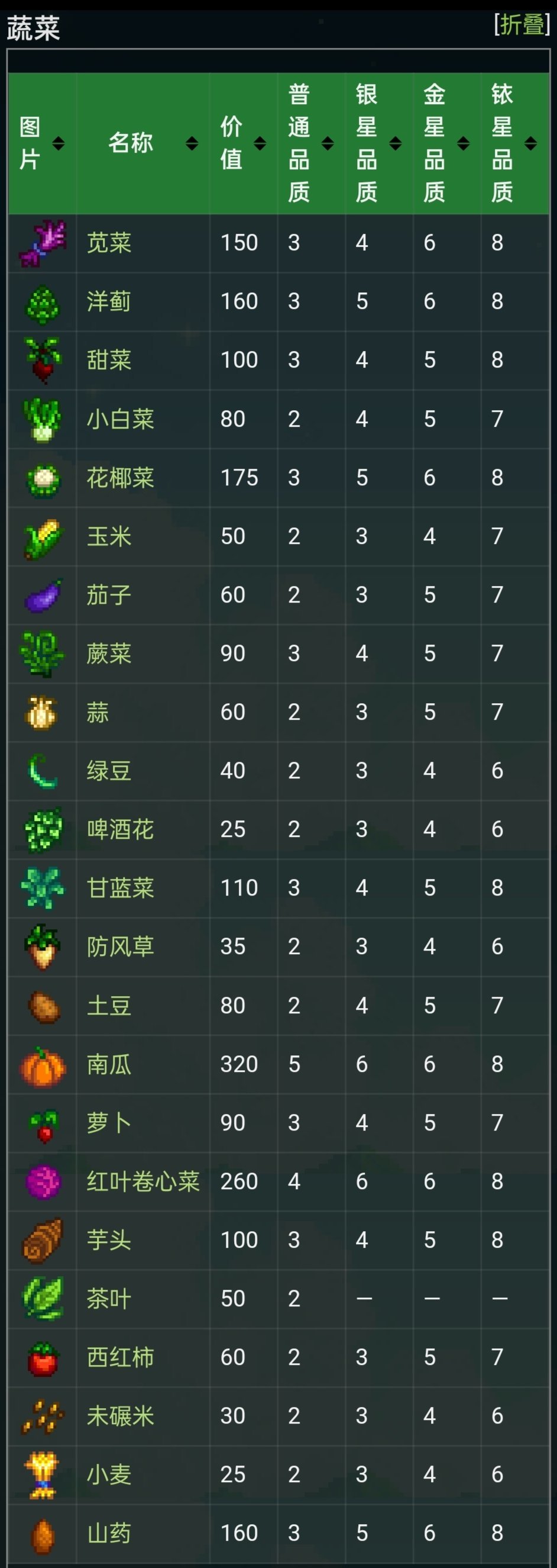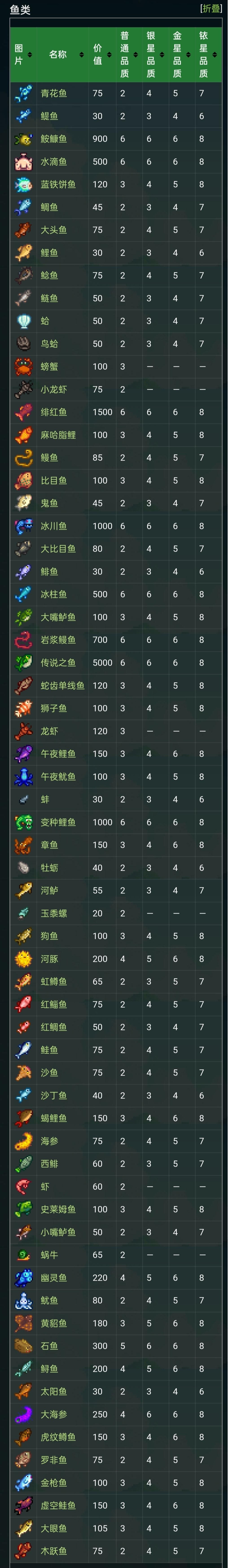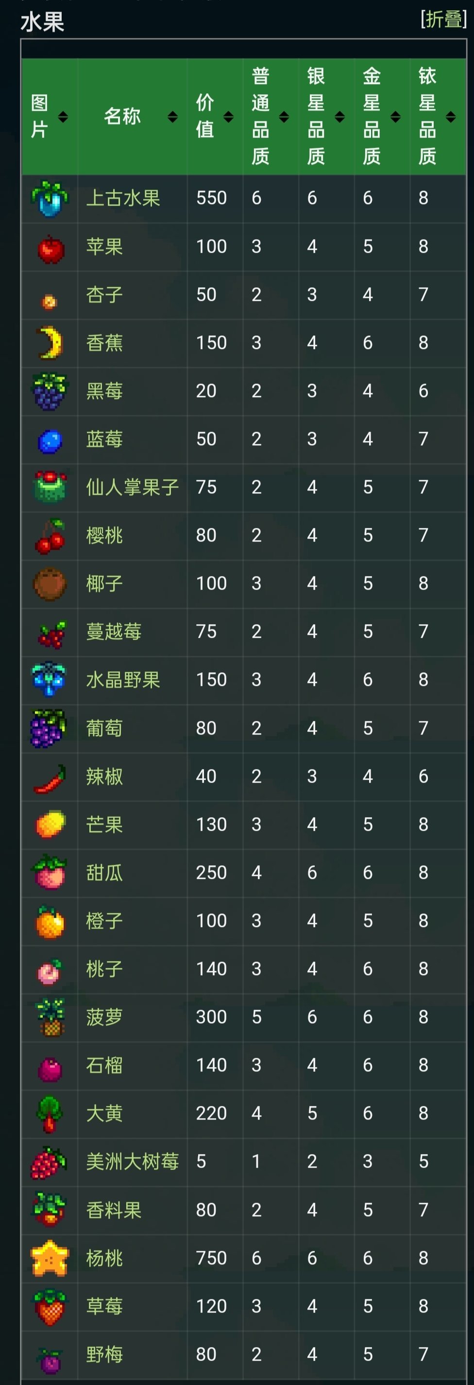 ④物品价值和品质的分数:这个就太多了,我下面就放鱼,蔬菜,水果这三类用的多的(省流版: 我简单点说就是放高星且贵的物品得到的分就越多),各位想看更多类别的可以自己上wiki看一下(百度搜星露谷物语wiki即可)