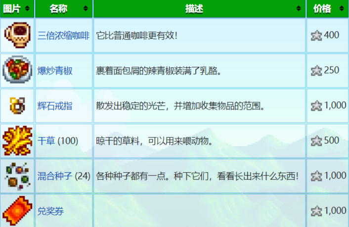 随机物品会从以下六种物品中随机抽选两种出来出售