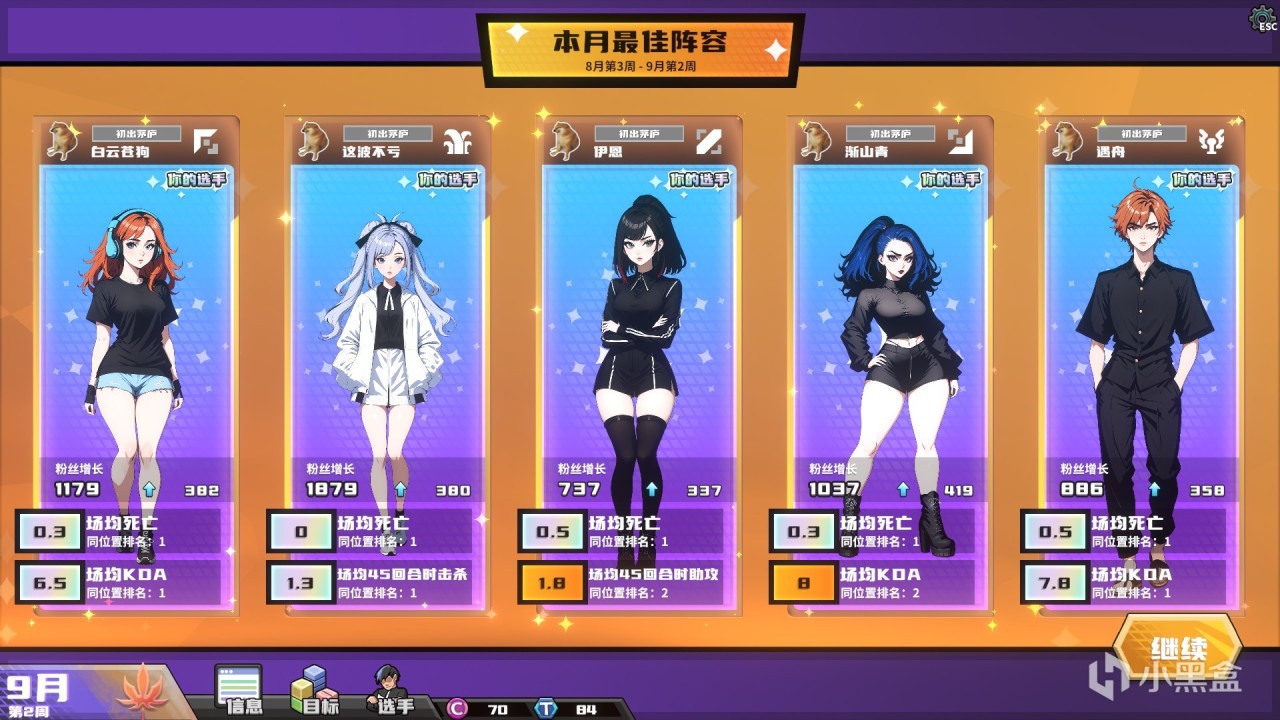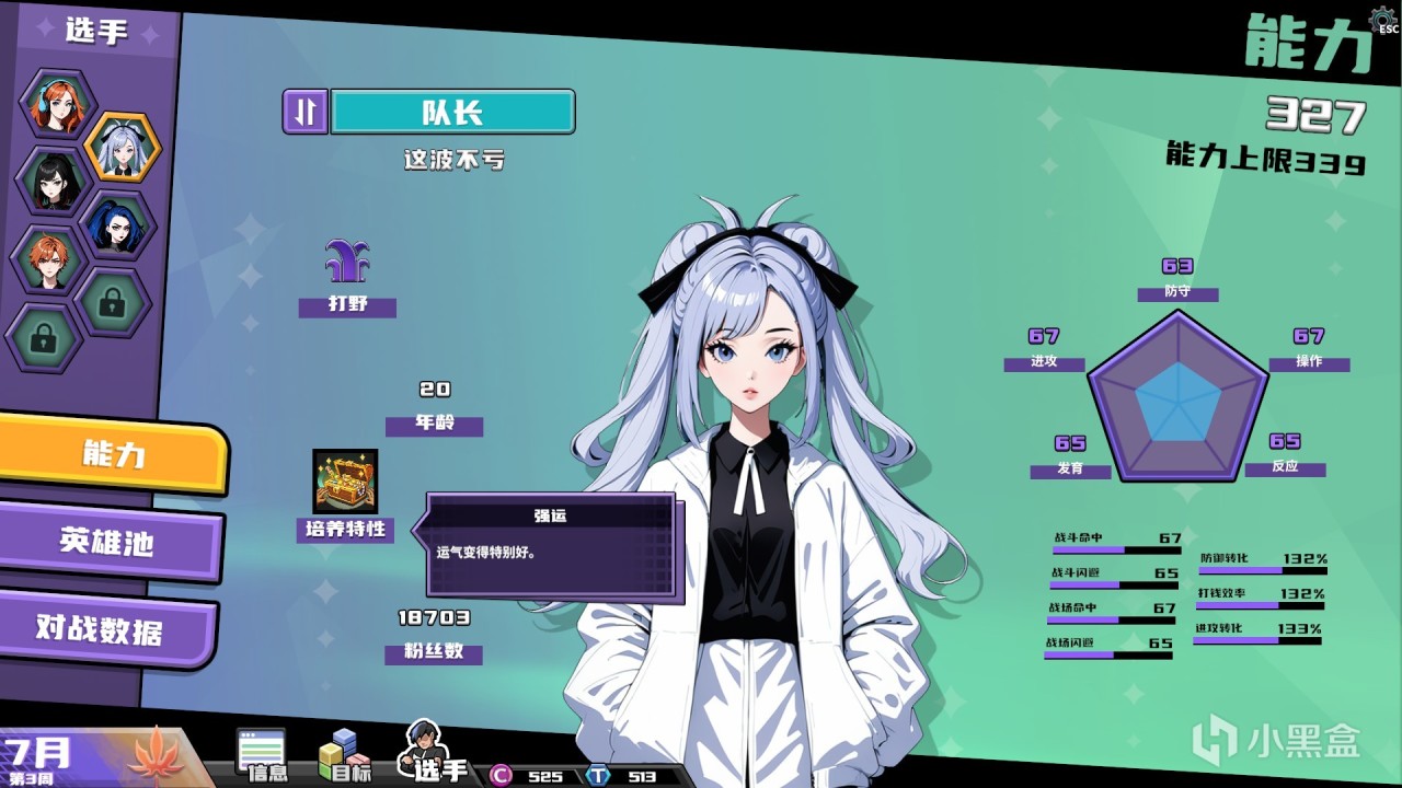 说回游戏本身,游戏的开局人员的特性比较重要(如果你想聘用他们到最后的话),提前想好队伍的风格和打法并选择不同位置合适的特性非常有必要。三狗的打野是经济转化,其他路都是支援和发育,意味着打野是队伍的核心和矛,其他人是稳定的支柱。这样的打法意味着BP中的先手十分重要,红色方的后手可能无法给打野拿到顺手的英雄,英雄池如果再薄弱一点的话基本上难以发挥了,所以队伍的核心不能只有一个,于是三狗还培养了ad作为第二个大腿,其他人的定位主要是支援,辅助和承伤。就这样,三狗目前打到了甲级联赛,基本上没有失败过。
