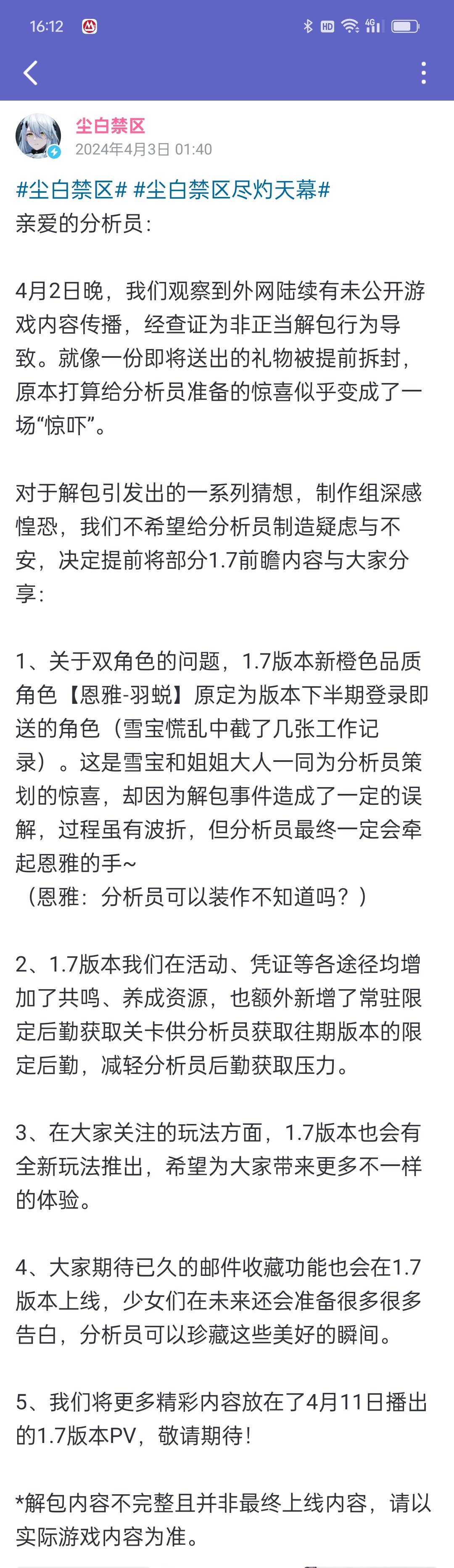 因爲一次外網的非正當解包的行爲,半夜nga突然出現了“一版本雙up逼氪”的節奏,在節奏尚未擴散到x吧和x站時就已經被官方的動態拿下了,放出了1月份的截圖表示其中一個新up大恩雅是早就決定要送,並解答了之前玩家提出的一些要求與疑問。此時的塵白被別有用心的人陰陽說“只有三流的廠家纔在半夜發動態養孝子”,殊不知這句話馬上將成爲迴旋鏢打在自己的臉上。