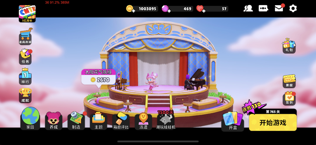 《潮玩国度》的玩法设计选择了「三消+」的形式。不同于常见的家装玩法形式,它结合潮玩题材做成了自由度更高的箱庭装扮玩法。