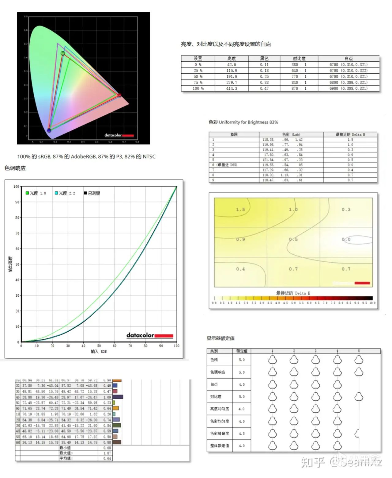最高亮度414nit,满足HDR400的亮度要求,整体评分中色域、色调响应、对比度、色彩精度均匀度都是接近满分的水平,整体来看素质非常高。