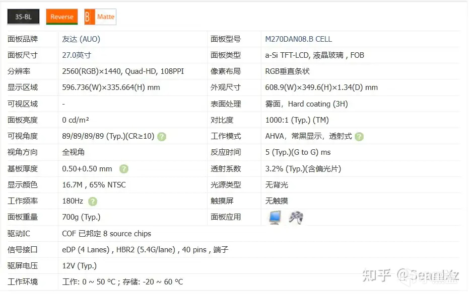 从屏库网上查到的信息如上,分辨率2560×1440,可视角度89/89/89/89,刷新率180Hz,RGB垂直排布像素点,表面雾化处理。