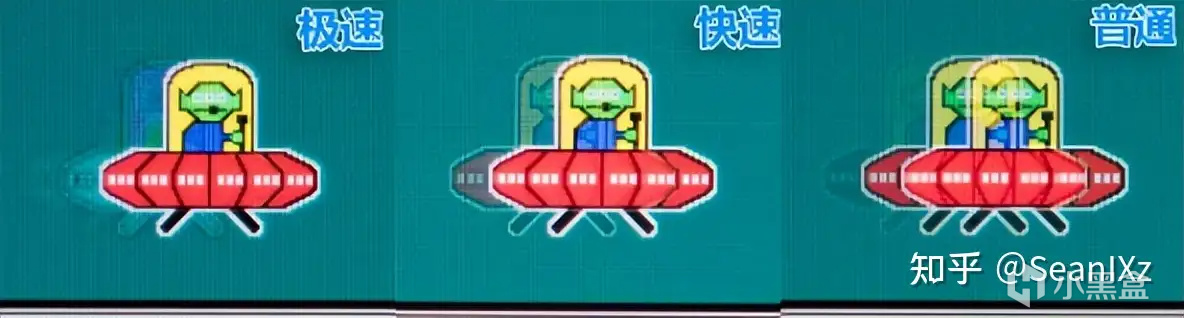 极速模式下是1层残影,第二层几乎不可见,目测是接近1ms的响应时间;快速模式下是2层残影,第三层有淡淡的轨迹;普通模式下是比较清晰的3层残影,极速模式下的拖影鬼影控制也不错,属于几乎不可见的水平。