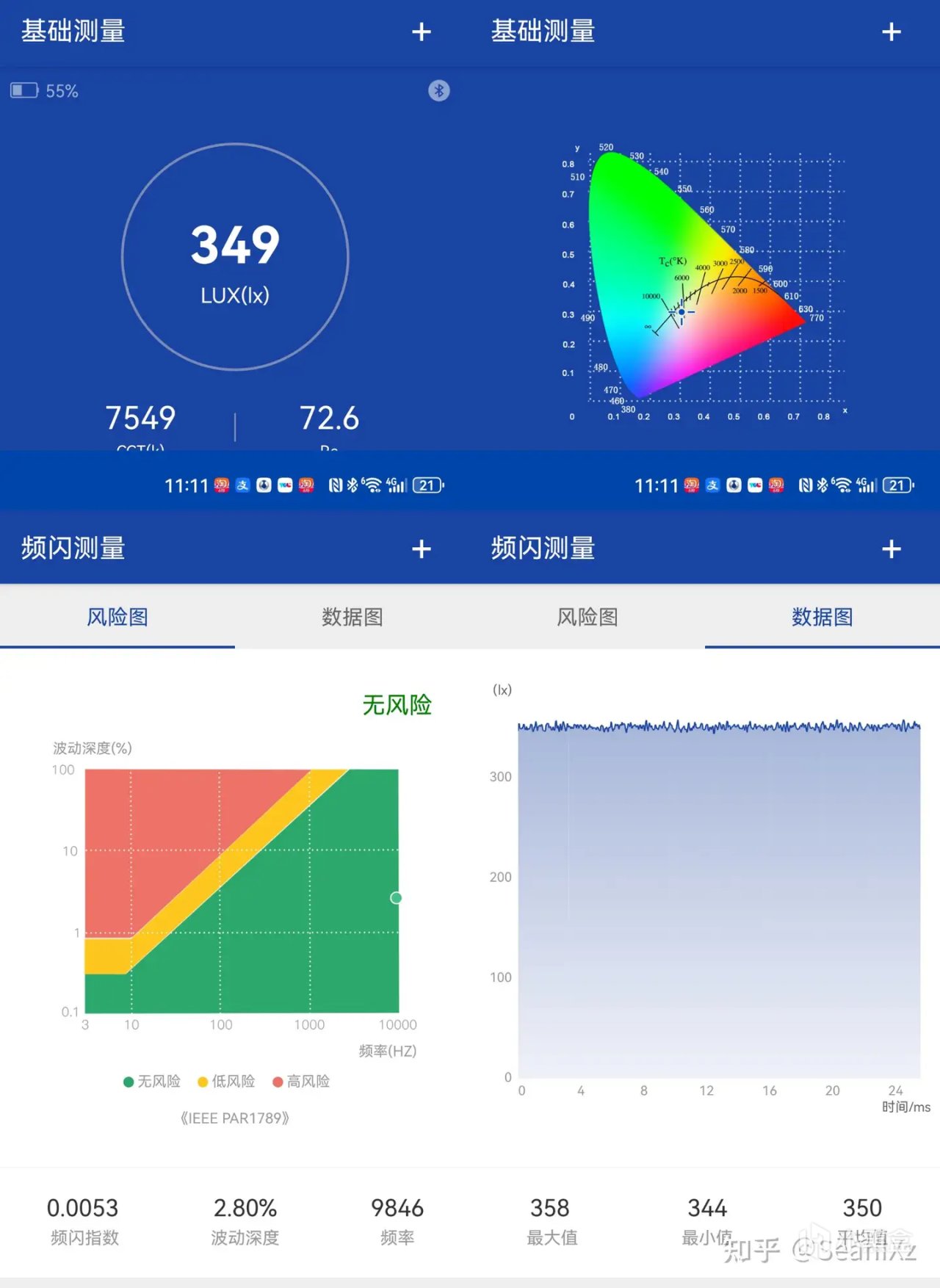 光源素质测量结果显示全屏显示白色画面时亮度可达349nit,频闪指数0.0053,光线强度十分稳定仅2.8%波动,采用的也是DC调光,完全没有频闪方面的风险。