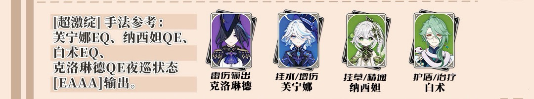 3.元素战技(E):E是最主要的输出方式,施放E就会立马进入核心的可持续7.5s的【夜巡】状态。在此状态下,施放A被称为【驰猎】,施放E被称为【贯夜】。