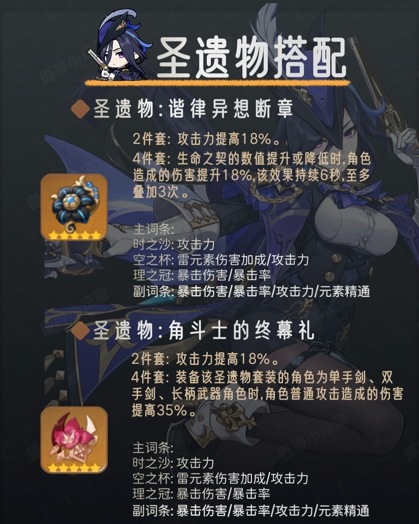 当然【角斗四件套】/【如雷+攻击 2+2】作为雷元素角色标配套装,可以暂时为克洛琳德装配。