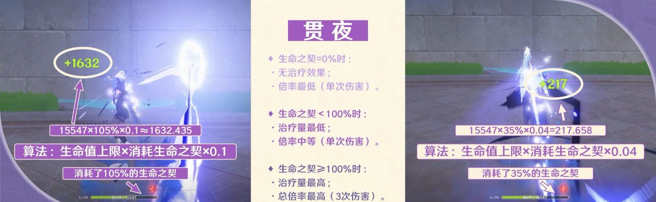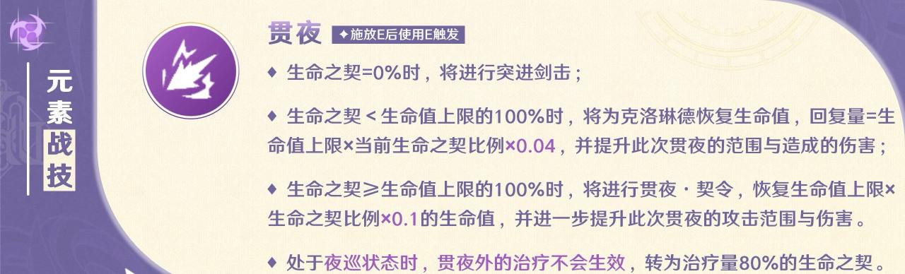 贯夜是突进剑击,是克洛琳德消耗生命之契的主要手段,在生命之契≥100%时,施放贯夜会造成3段伤害(总倍率最高),且会恢复自身生命值。当生命之契<100%时施放贯夜,伤害倍率相比来说要低一些且治疗量也低一些。若是没有生命之契时,伤害倍率最低,且没有治疗效果。