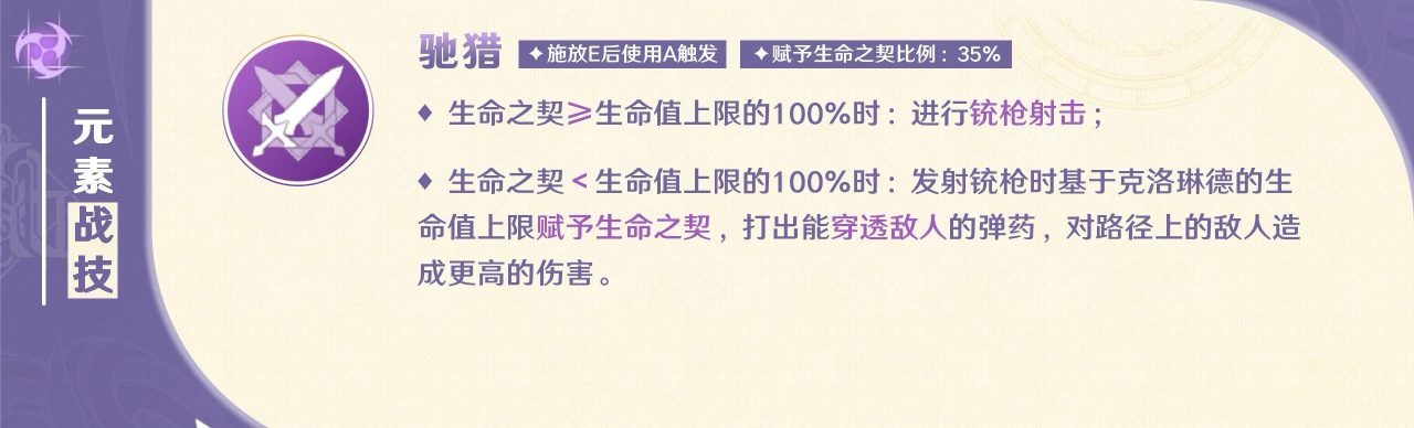 驰猎是铳枪射击,是克洛琳德叠加生命之契的主要手段之一,在生命之契<100%时,每次施放驰猎都会叠加35%的生命之契,且具有穿透群伤效果,伤害倍率在驰猎中也是最高的。