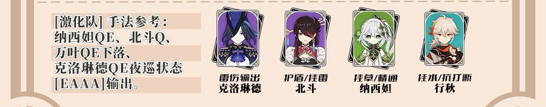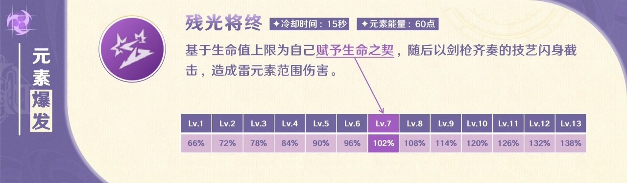 4.元素爆发(Q):施放Q会造成5段雷伤,每隔1次伤害就可对敌人施加1次弱雷附着,共可施加3次。在Q倍率这个板块,属于多段低倍率加持出的整体倍率高的特性。这个设定的优势是享受伤害值提升的收益会放大,比如激化反应。而劣势则是无法看到大数字伤害。升级Q不但可以提升Q的伤害能力,最主要的是可以提高施放Q获取的生命之契比例,在7级时就可达到102%,所以建议是Q至少需要升到7级。这样在常规的手法操作中,咱们就可以先Q起手,然后接E开启夜巡状态,接着继续接E消耗生命之契打出最多伤害的贯夜,之后就是使用3A+E的循环手法一直到夜巡状态结束就可退场进入队伍循环。