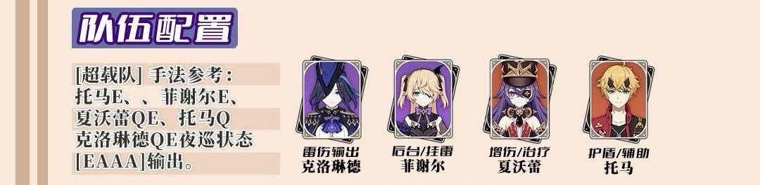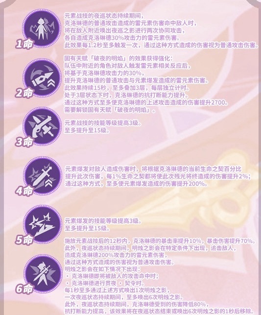 1.克洛琳德是一位雷元素单手剑输出角色。当通过元素战技进入[夜巡]状态后,可以对敌人持续造成高频率的雷元素伤害。攻击干脆利落,手感上佳。