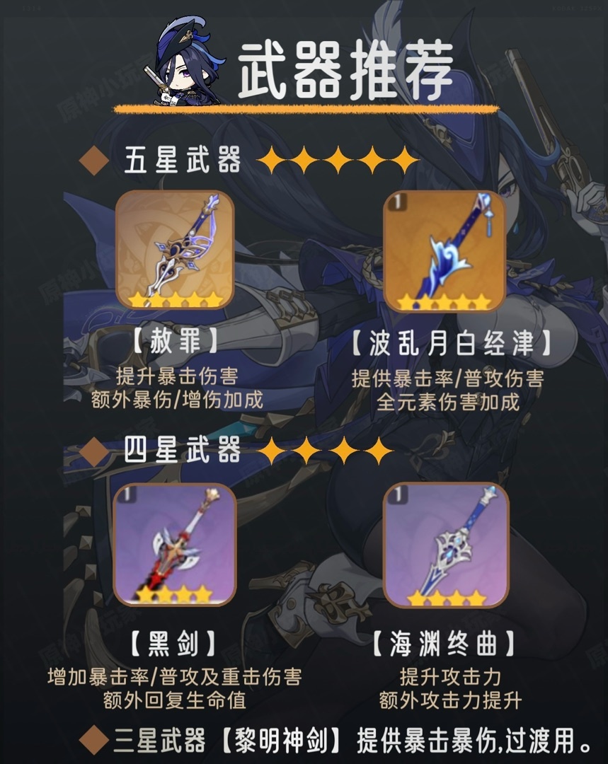 2.武器方面克洛琳德作为一位雷元素输出角色,在武器选择方面主要以[输出]武器为主。除了图中的武器,武器的选择还可以是:【有乐御簾切】、【裁叶萃光】、【苍古自由之誓】、【东花坊时雨】、【暗巷闪光】、【黑岩长剑】、【铁蜂刺】