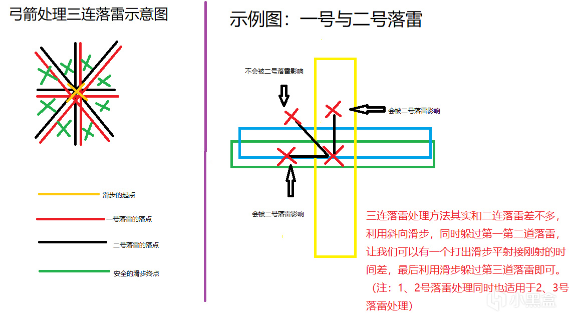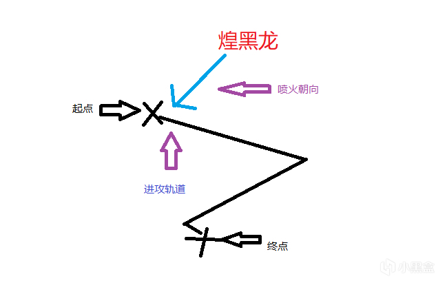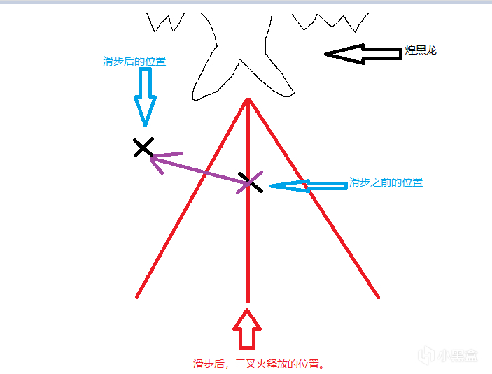 (三連落雷沒有畫出來,如果你熟悉處理方法,三連落雷是無法威脅到左右臉站位的獵人的、直線火的話,只有你不是盲目滑步,那麼煌黑龍使用直線火它也是需要時間補正的,它補正你也跟着補正自己的位置即可。)