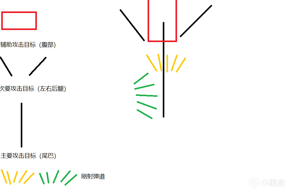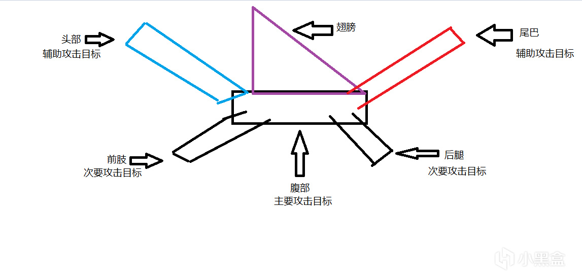 補充說明一下,正面的主要攻擊目標爲頭部,輔助攻擊目標是胸口(腹部), 次要攻擊目標爲前肢。 主要攻擊目標是主要攻擊的目標,輔助攻擊目標是指如果快打空或者無法攻擊到主要攻擊目標時用來補傷害的,次要攻擊目標同理。