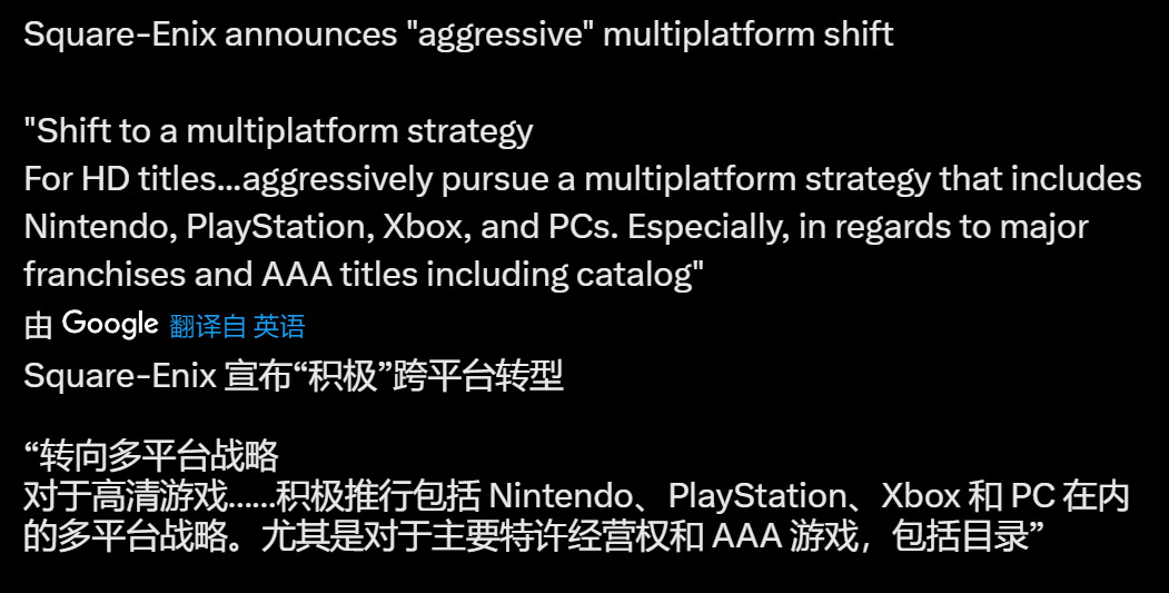 在5月中旬,Square Enix正式宣布将其发展战略由“数量型”转变为“质量型”与“多平台型”,意味着公司未来的高清游戏作品将全面覆盖任天堂、Xbox、Playstation以及PC等多个平台。这一战略调整之后,有迹象显示微软可能与Square Enix达成了某种出版合作意向。