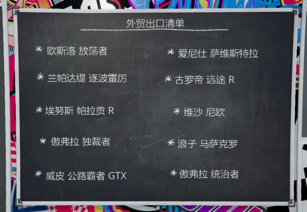 外貿出口載具參與方式:在您擁有自己的改裝鋪資產後,於改裝鋪二樓可看到一塊黑板寫有外貿出口載具,您並不需要去記下這些載具,因爲當您在洛聖都偶遇這些載具時,在地圖上會以藍色小點呈現,將其運送至碼頭可換取收益;