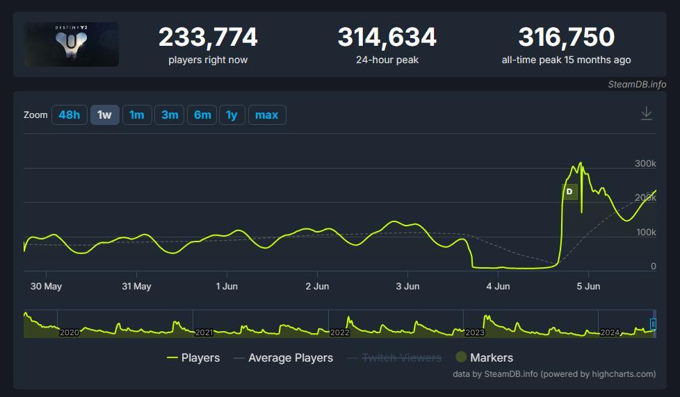 《命运2:终焉之形》是《命运2》内容扩展的一个重要里程碑,6月5日上线之日数据表现非常惊艳,让《命运2》在Steam上的24h同时在线人数超过314K,跻身Steam平台最多游玩榜前三名。尽管该扩展包在预购阶段遇到了一些挑战,但我们相信它会凭借其丰富的内容和创新的设计最终赢得玩家的认可。对于新玩家来说,免费的游戏本体、平易近人的入门引导以及过往内容的极低折扣,大大降低了游戏门槛,使得更多玩家有机会沉浸在《命运2》的世界中。而对老玩家来说,高潮迭起的剧情、熟悉的面孔的回归以及前所未有的挑战,都是对他们忠诚追随的回馈。