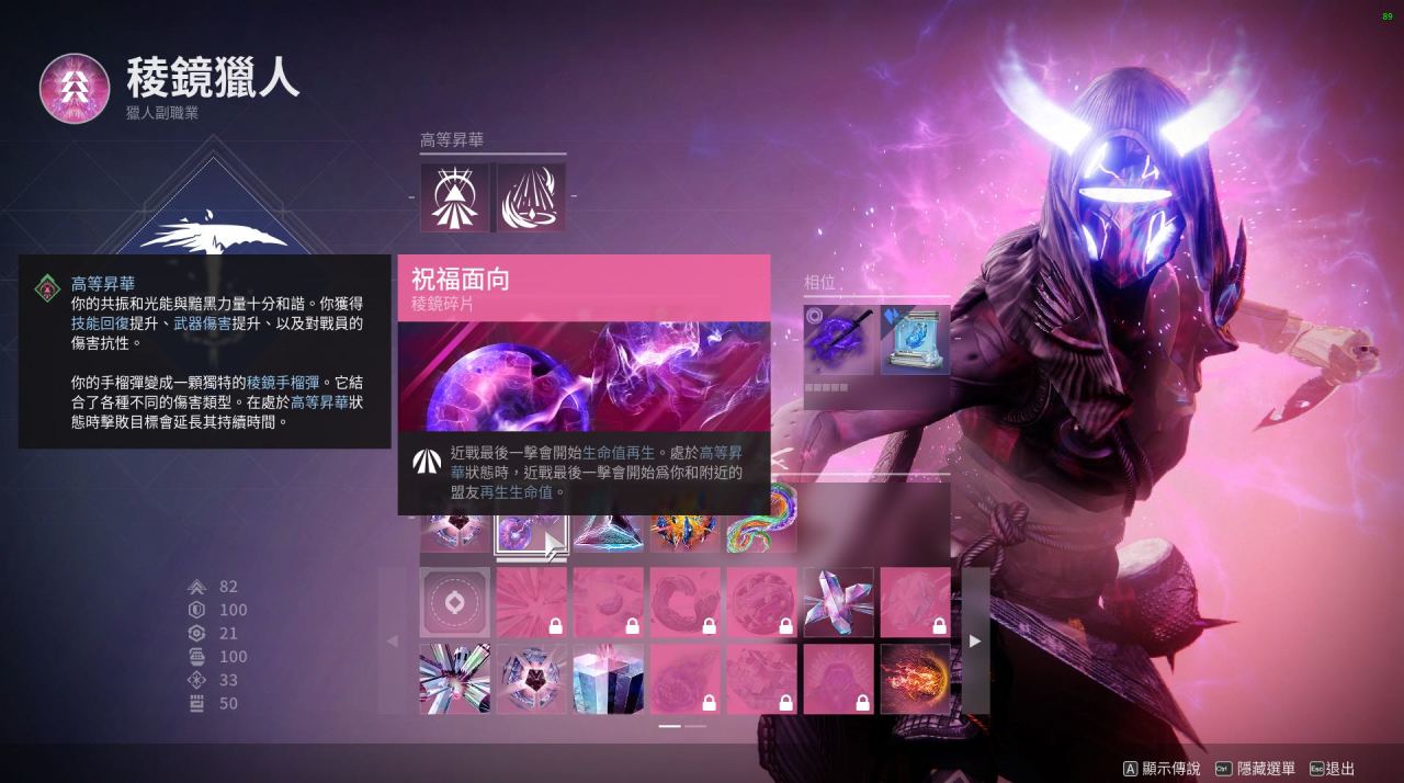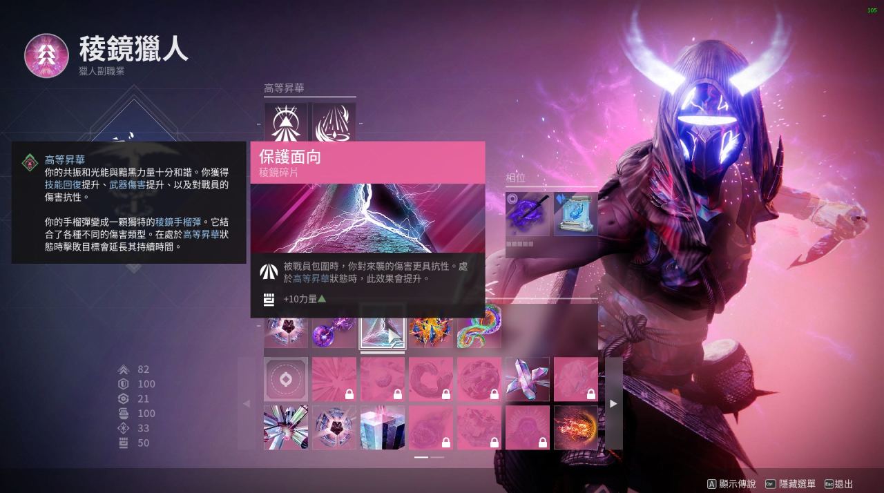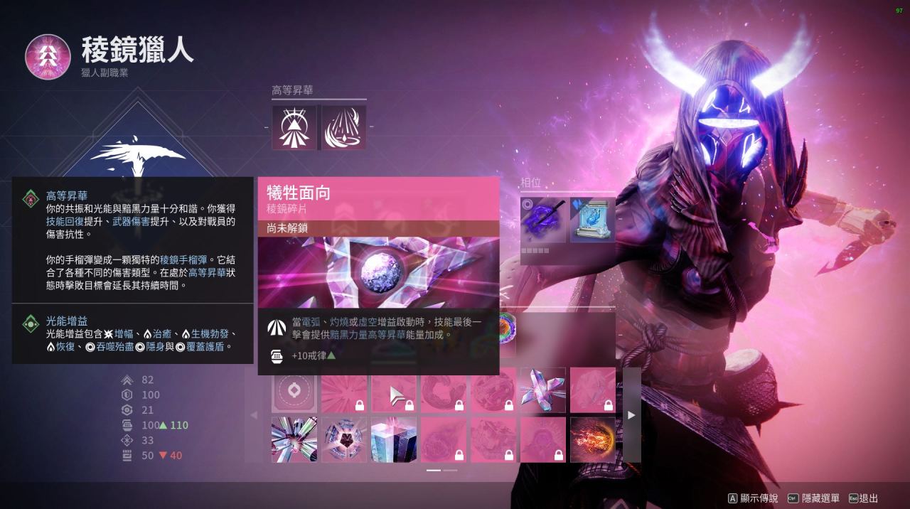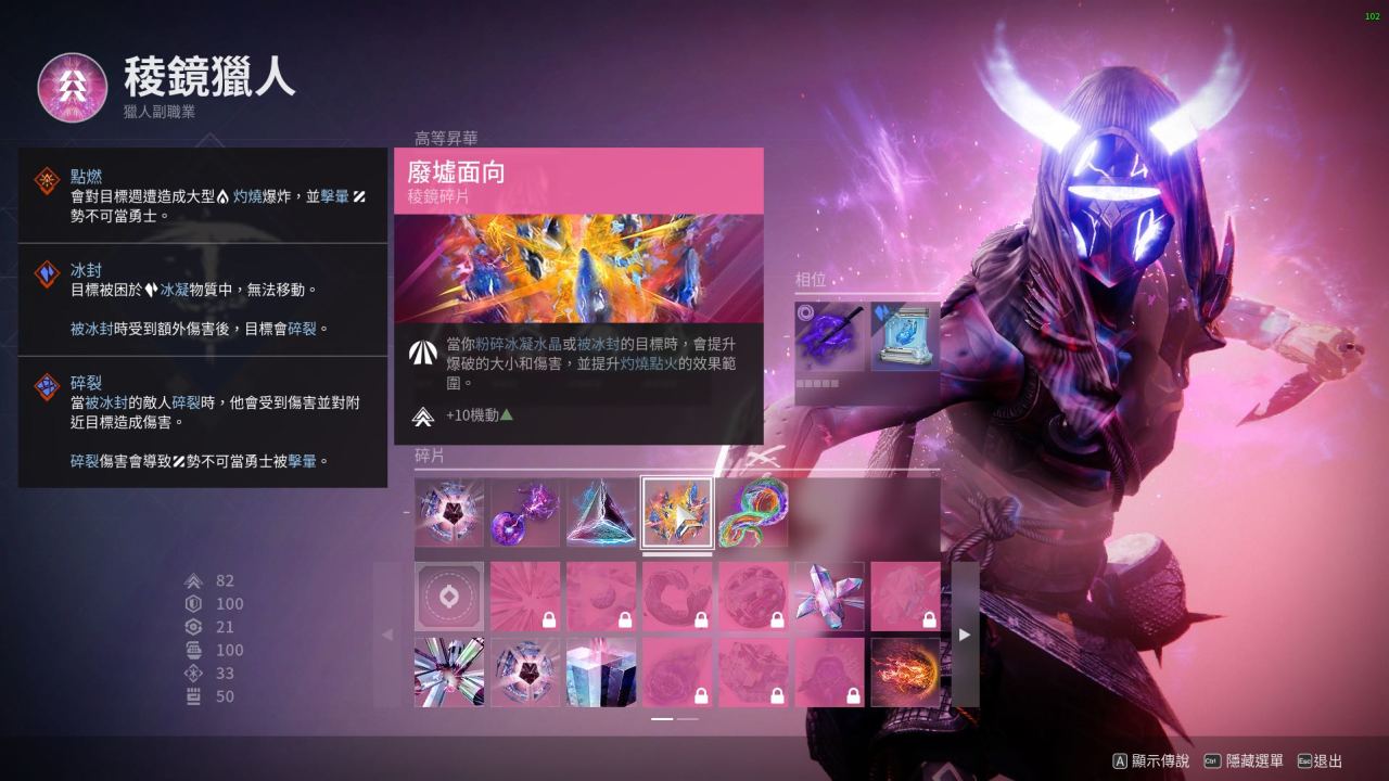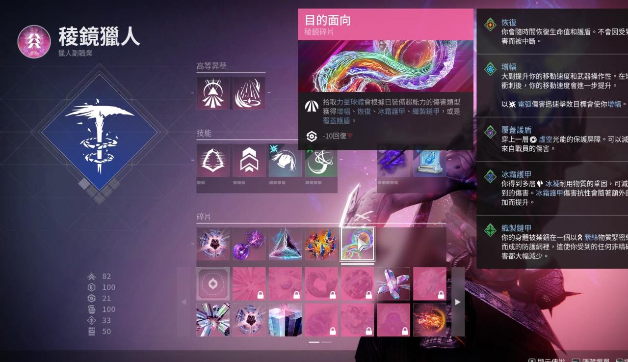 最後:本套配裝是我開荒用的一套 比較有意思的棱鏡獵人配裝 閃身凍結後一拳碎冰真的很爽 武器可以帶上深埋血脈 加上吞噬食用效果更佳!不僅手雷多多 生存能力更強 而且搭配催化可以遠程隱身後再接近敵人閃身 不容易暴斃
