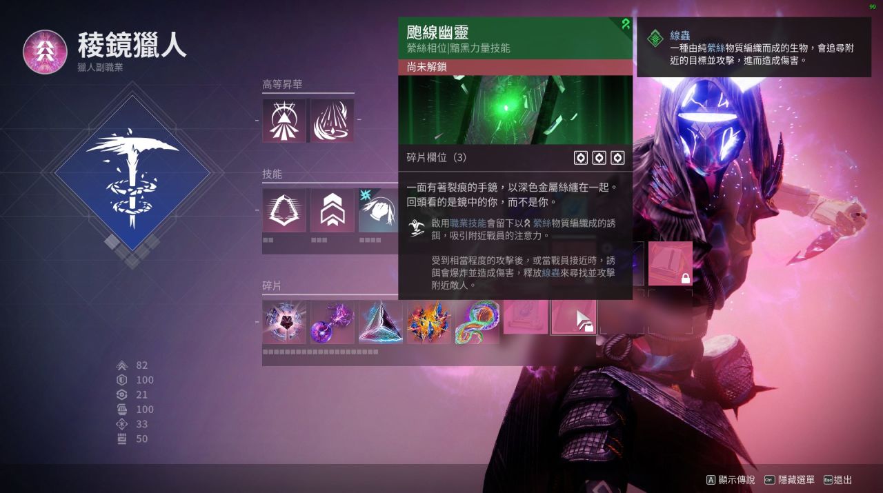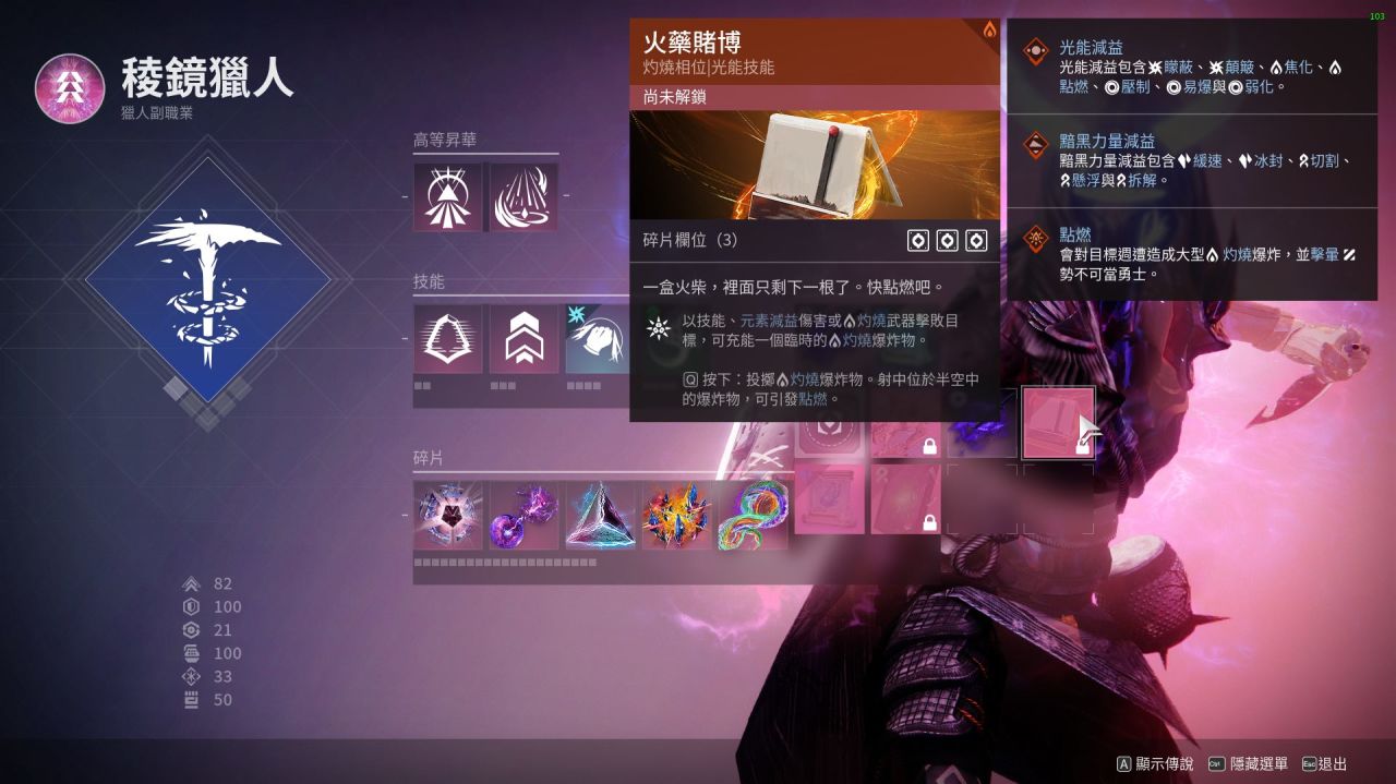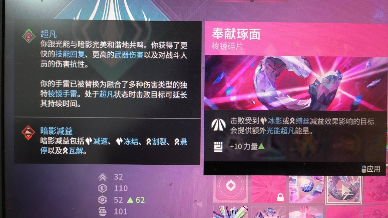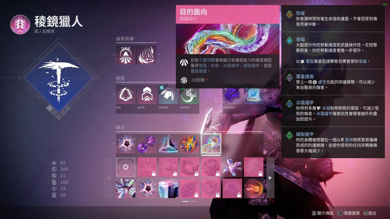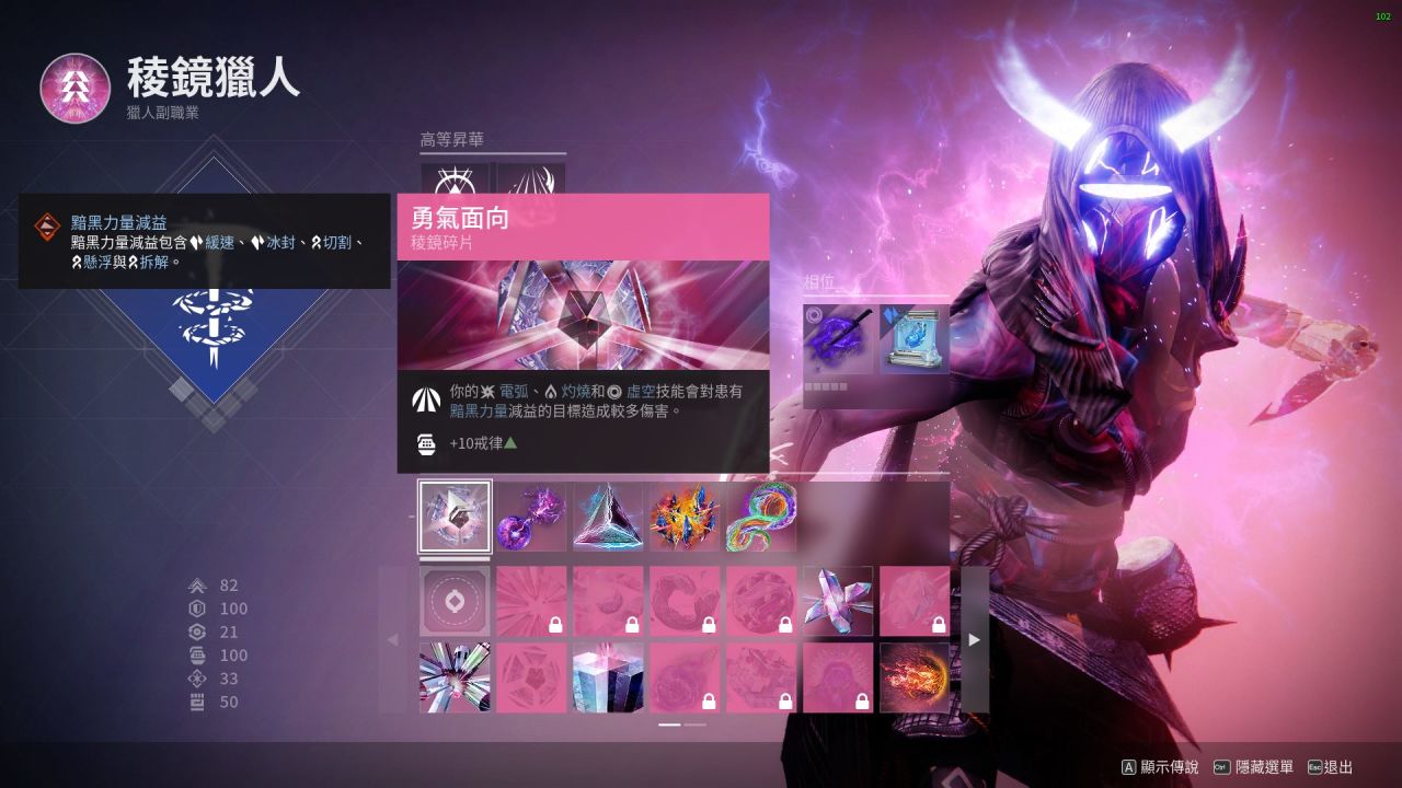 最後:本套配裝是我開荒用的一套 比較有意思的棱鏡獵人配裝 閃身凍結後一拳碎冰真的很爽 武器可以帶上深埋血脈 加上吞噬食用效果更佳!不僅手雷多多 生存能力更強 而且搭配催化可以遠程隱身後再接近敵人閃身 不容易暴斃