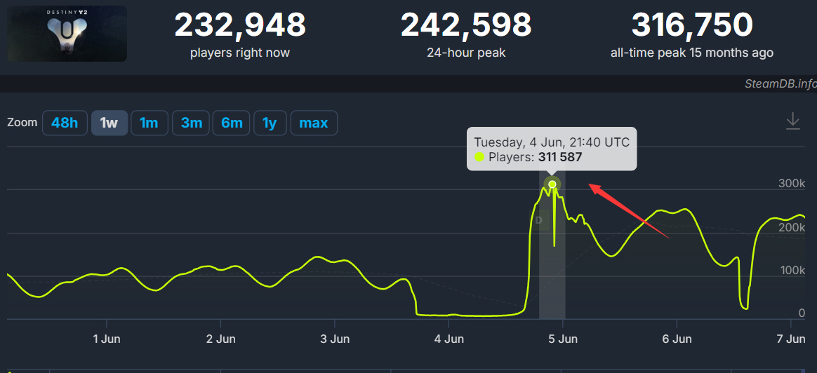 在玩家人數方面,《命運 2》的近期在線峯值突破了 31 萬,差點就破了之前的記錄!隨着週末的到來,玩家峯值必定會上漲: