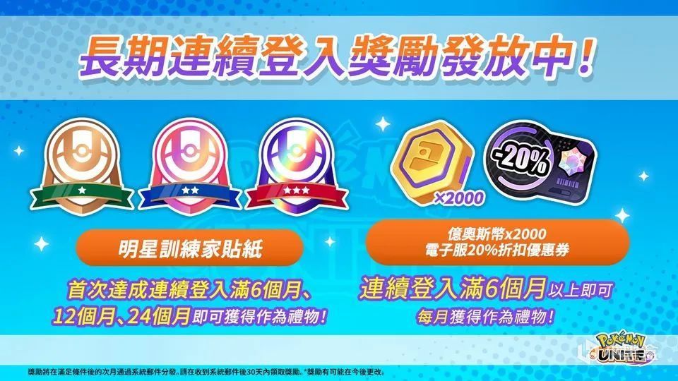 若訓練家連續6個月以上每月登入遊戲至少1次,可獲得億奧斯幣和折扣優惠券等作爲禮物。