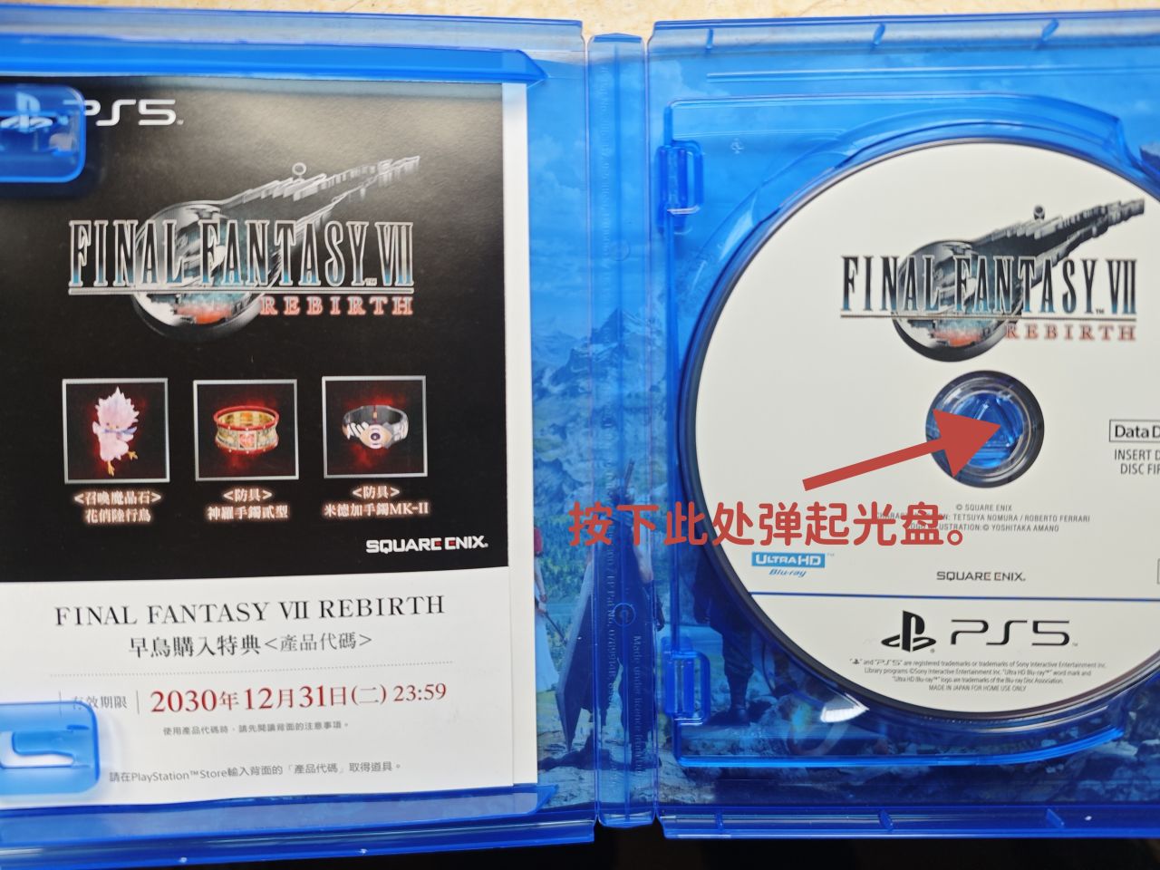 拿到新光盘后在侧边会有易拉条的开口,顺着拉开就行,盒子里左侧有说明书、健康使用说明和特典卡等(不是所有游戏都有),右边为光盘本体,部分游戏为双光碟版。取出光盘时按下光盘中心的按钮光盘会自己弹起,中指或食指插入光盘中心孔,拇指扶住边缘,尽量避免光盘数据面与任何物体接触,插入机器时注意方向,数据面朝外,插反读不出来。