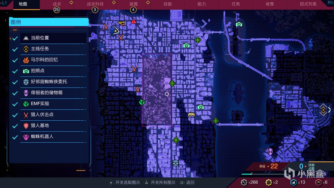 《漫威蜘蛛侠2》足足包含了:共生体巢穴、文化博物馆、不明目标(机械飞鹰)、迷境馆(英雄代币)、布鲁克林远见学院、圣火,蜘蛛机器人、拍摄、马尔科回忆、储物箱、好邻居委托、猎人伏击点等十多个类别。