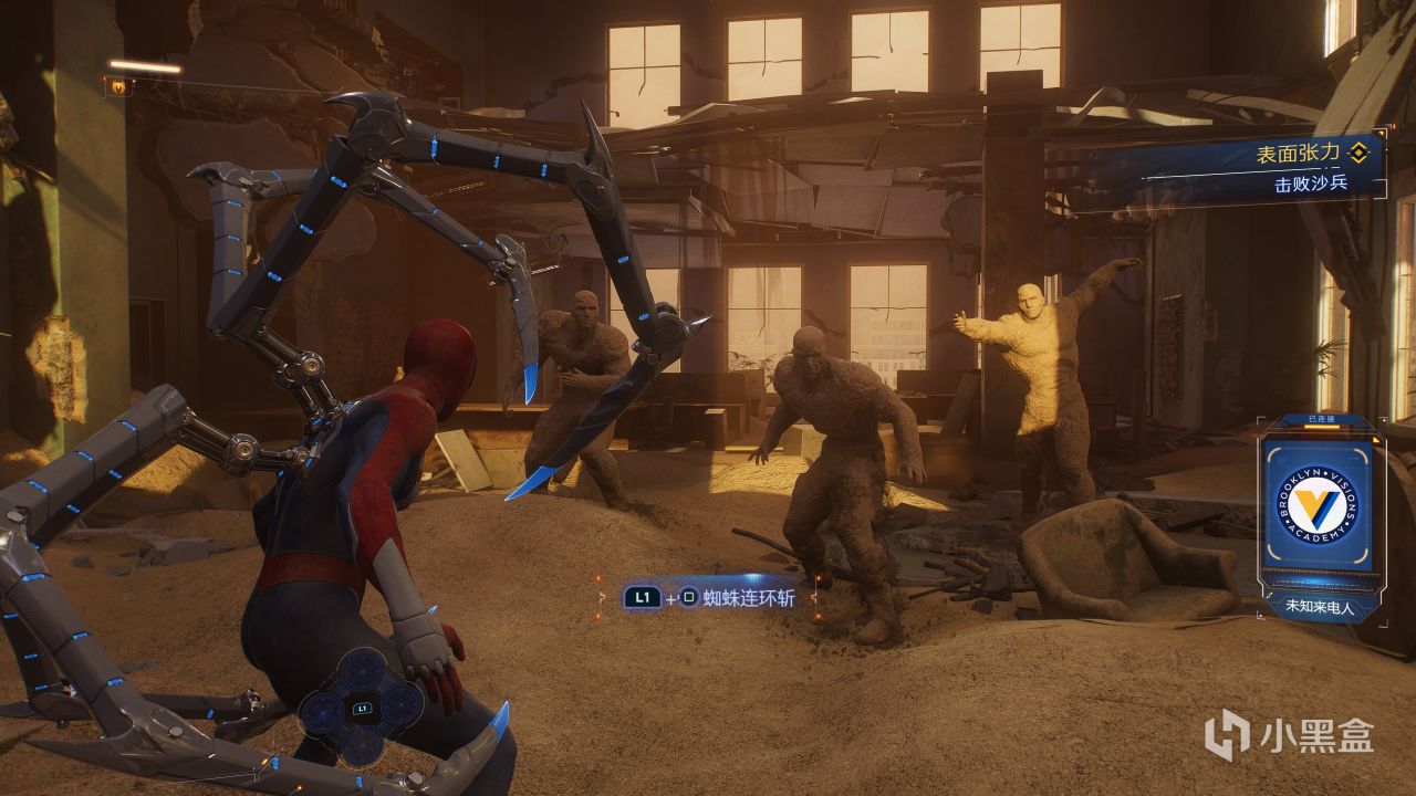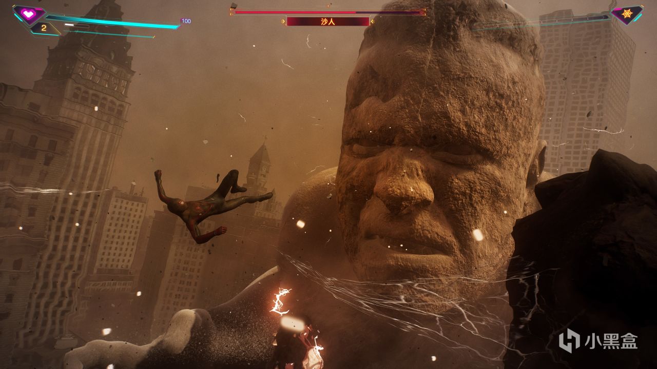 打开《漫威蜘蛛侠2》,首先来了一场可谓是“集大成”的巨型沙人BOSS战,我们需要不断追逐于他所身处的区域,不断完成和巨人沙人之类的跑酷和战斗,这一段设计的实在是精彩,因为它以一己之力完成了很多内容: