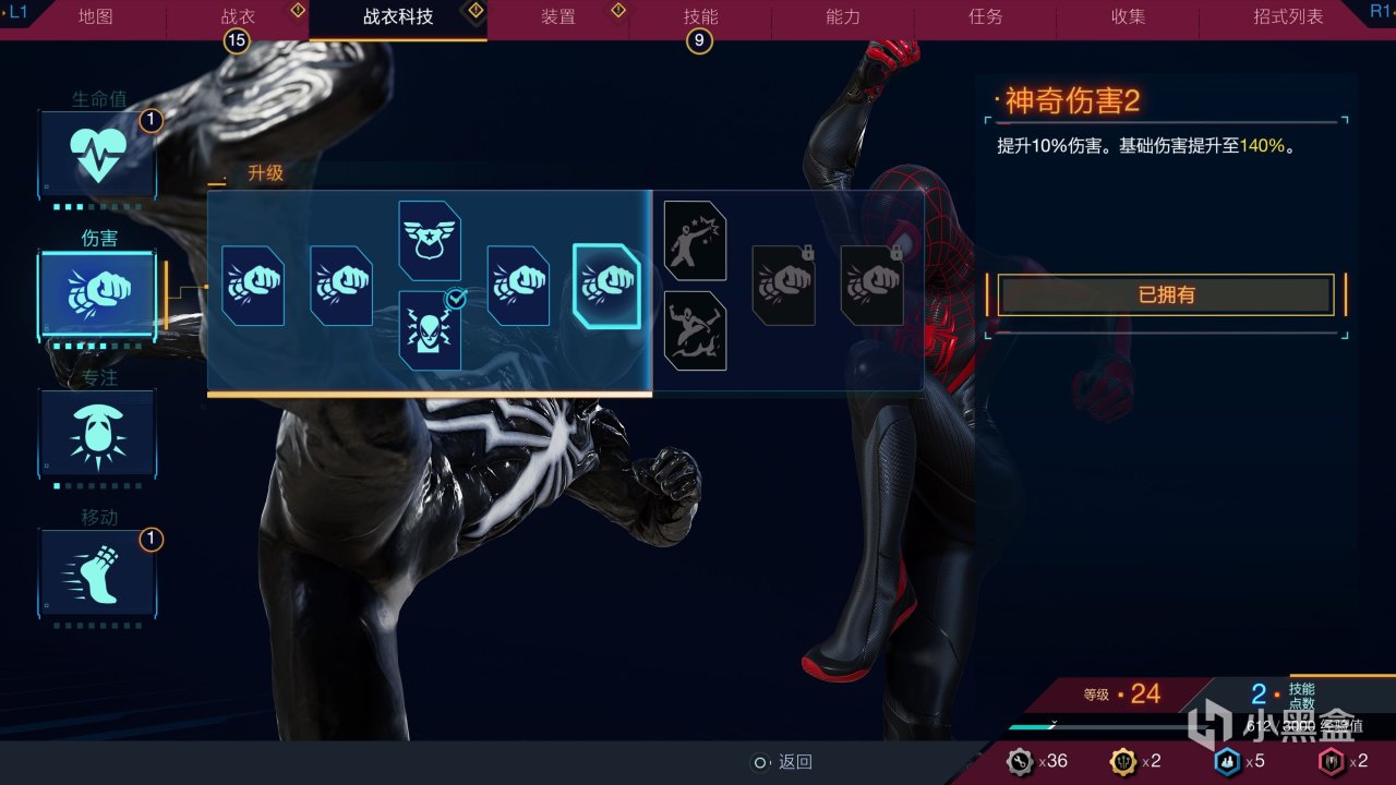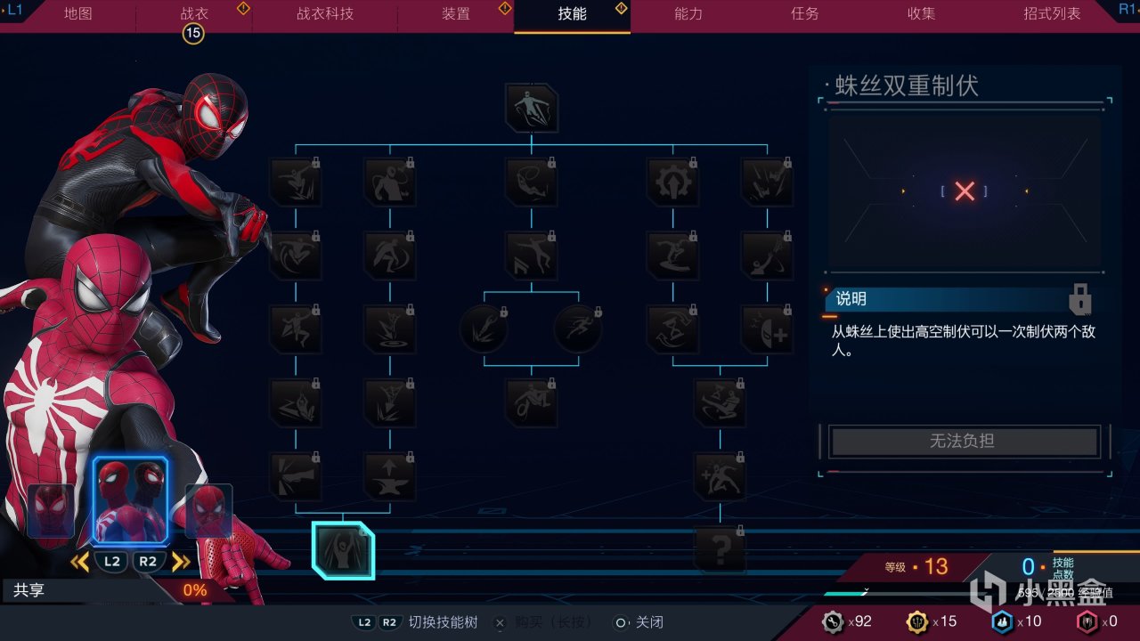 两人的加点,开始我觉得点数完全不够用。因为共通系的格挡线可以超级攒能量(用来回血或处决)、拖拽系的缴械和拉束缚单位可以很好的对抗远程敌人,这就让两位蜘蛛侠没有多少余裕去强化自己的技能树。
