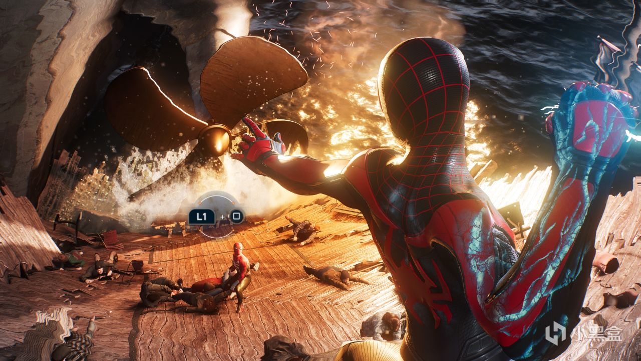 从彼得帕克的蛛网封眼重击到迈尔斯莫拉莱斯的“让我好好电电你”,除此以外,两人还有利用水箱完成协作打击的流程,这几段机制战斗可能从操作上并不算复杂,但是演出效果拉满,让人目不转睛,大呼过瘾。