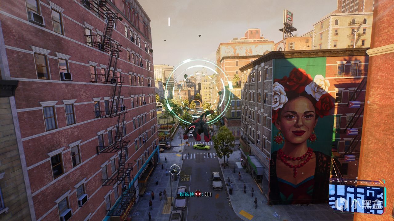 《漫威蜘蛛侠2》的跑酷,不仅仅是前面两作的“复习”,而是加入了非常重要的新系统滑翔:空中按三角可以展开滑翔翼,除了大幅度增加滞空能力以外,还可以在城市中的气流带(绿圈)中完成快速的穿梭,体验就像是索尼克光速进圈一样;