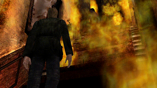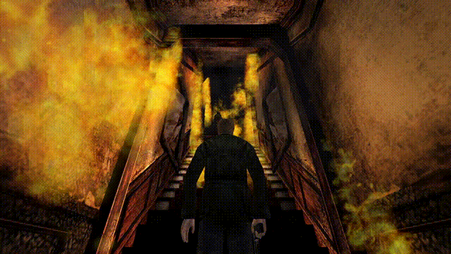 我们走进燃烧着熊熊大火的楼梯间,而在此之前,里世界的湖景酒店明明是破败,甚至是潮湿的。