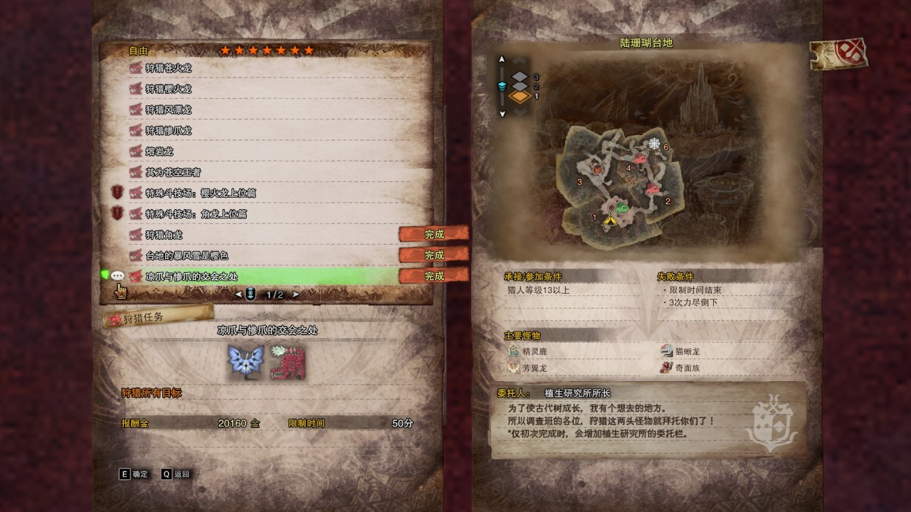 調查任務只要你一直調查痕跡是做不完的,作用是刷怪物材料,有更多的獎勵。自由任務如果沒有強迫症的話只需要做任務名字前有對話框的,右下角會寫完成後給予的獎勵。