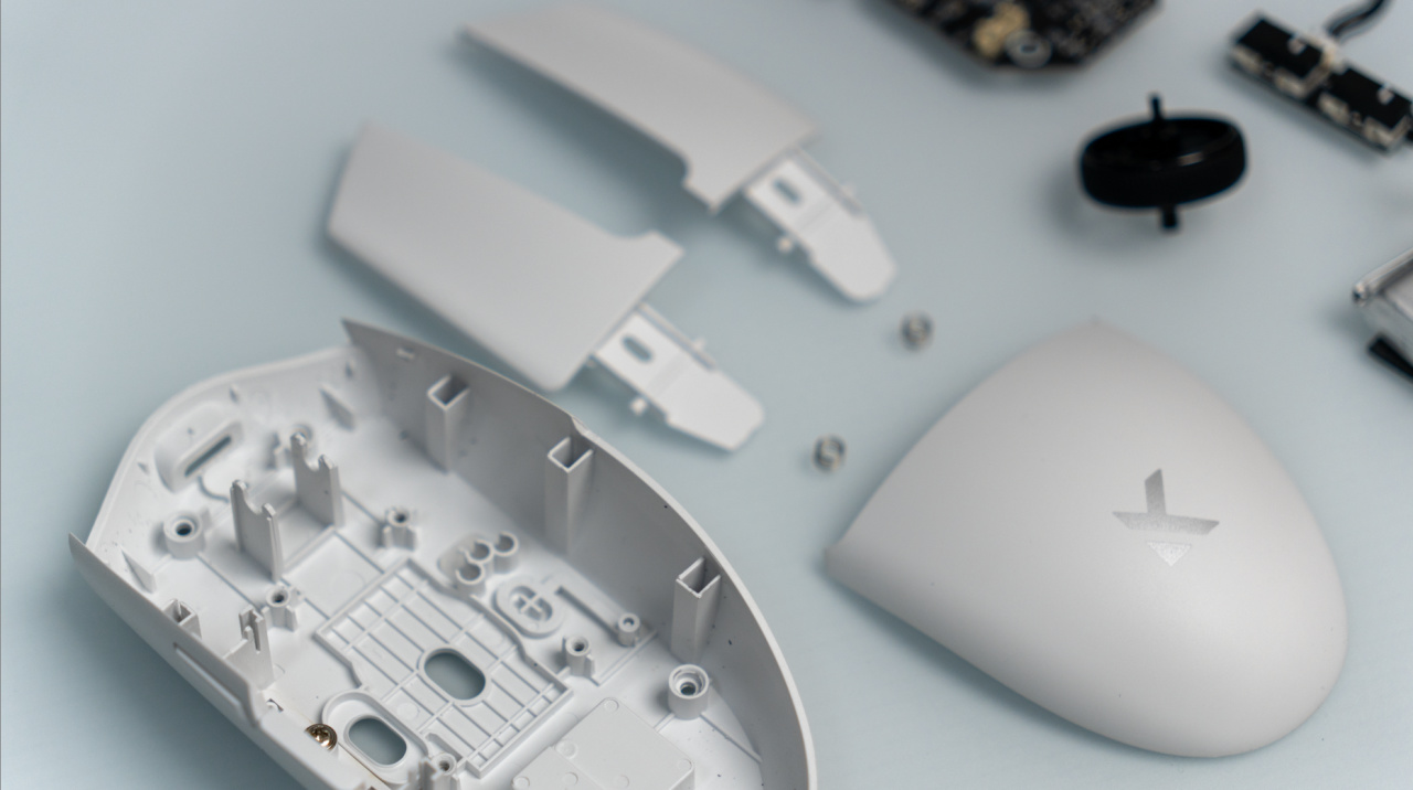 打开鼠标可以看到这次G3采用了一个比较少见的地包天方案,通常鼠标的上盖和侧裙是是一体的,然后把上盖扣在底壳上,但这次G3则是反过来,它的底壳和侧裙是一体注塑成型的,反而上盖是独立的一块。