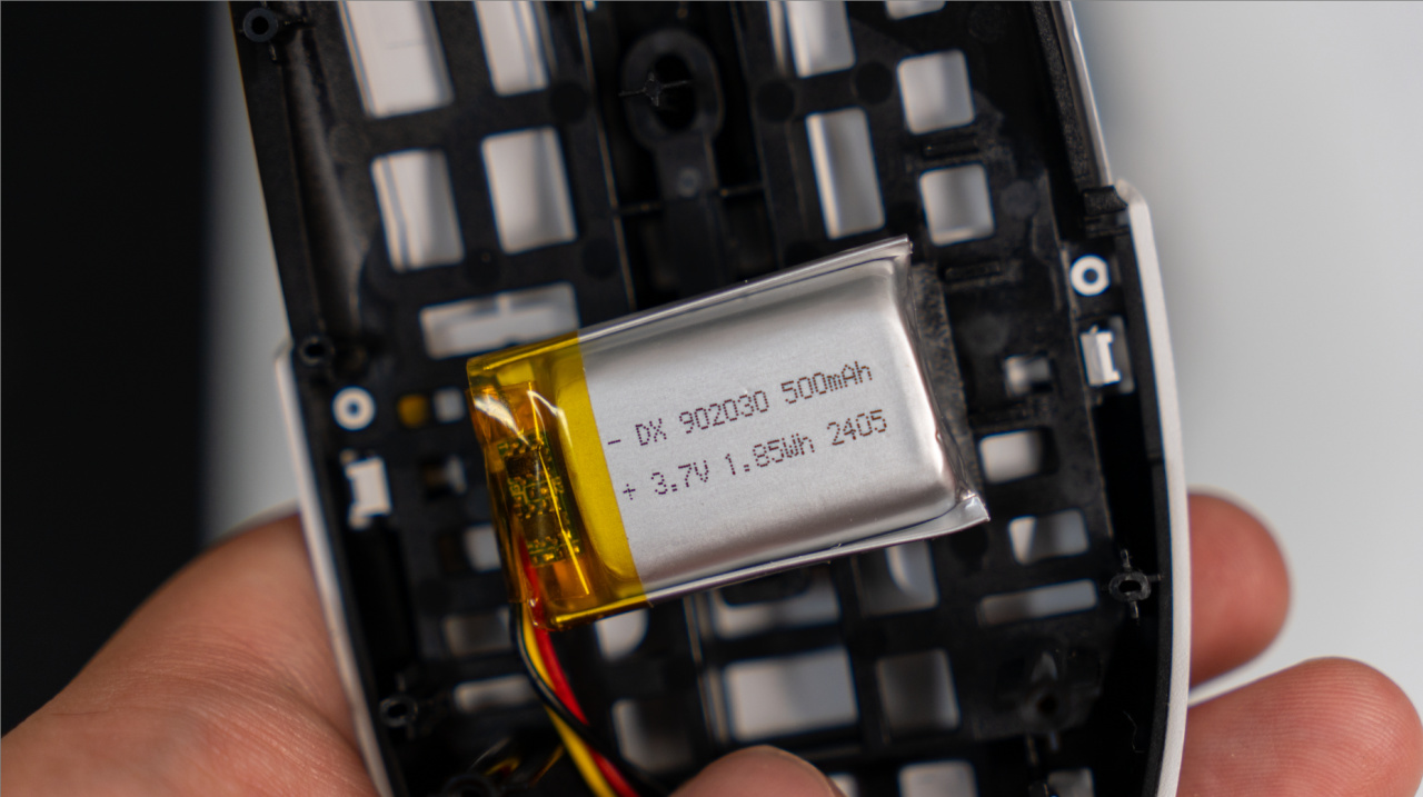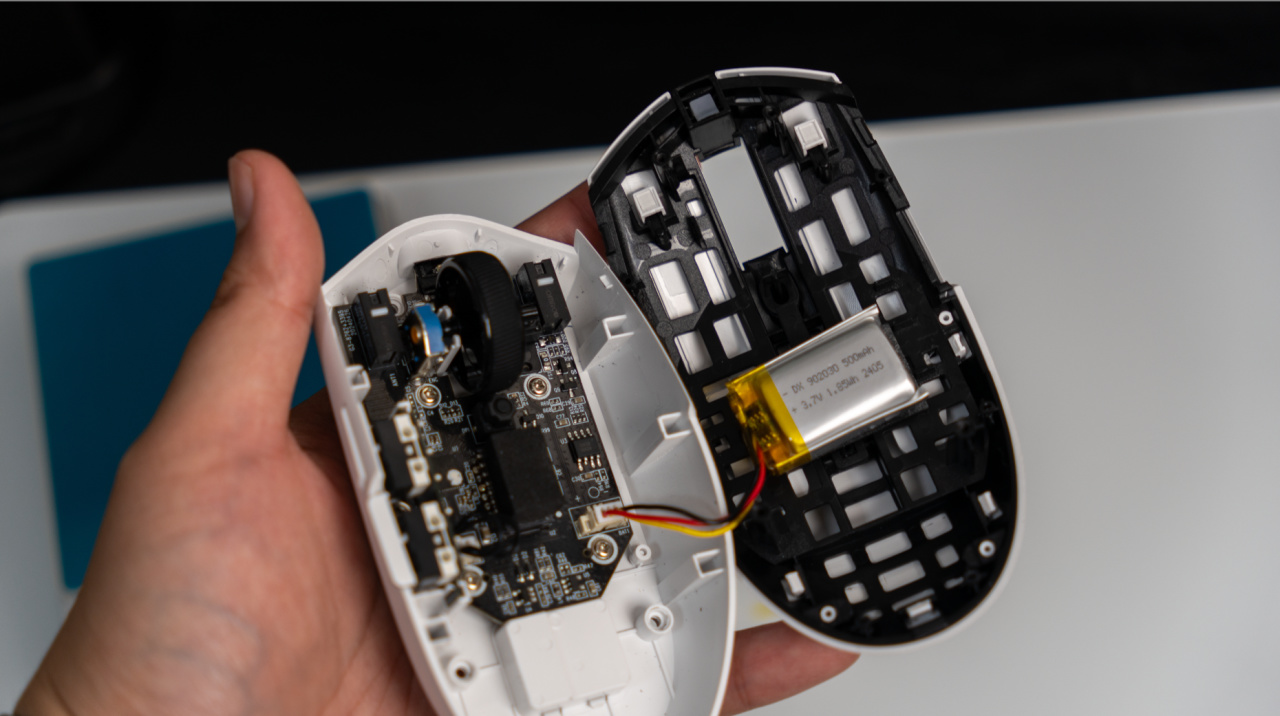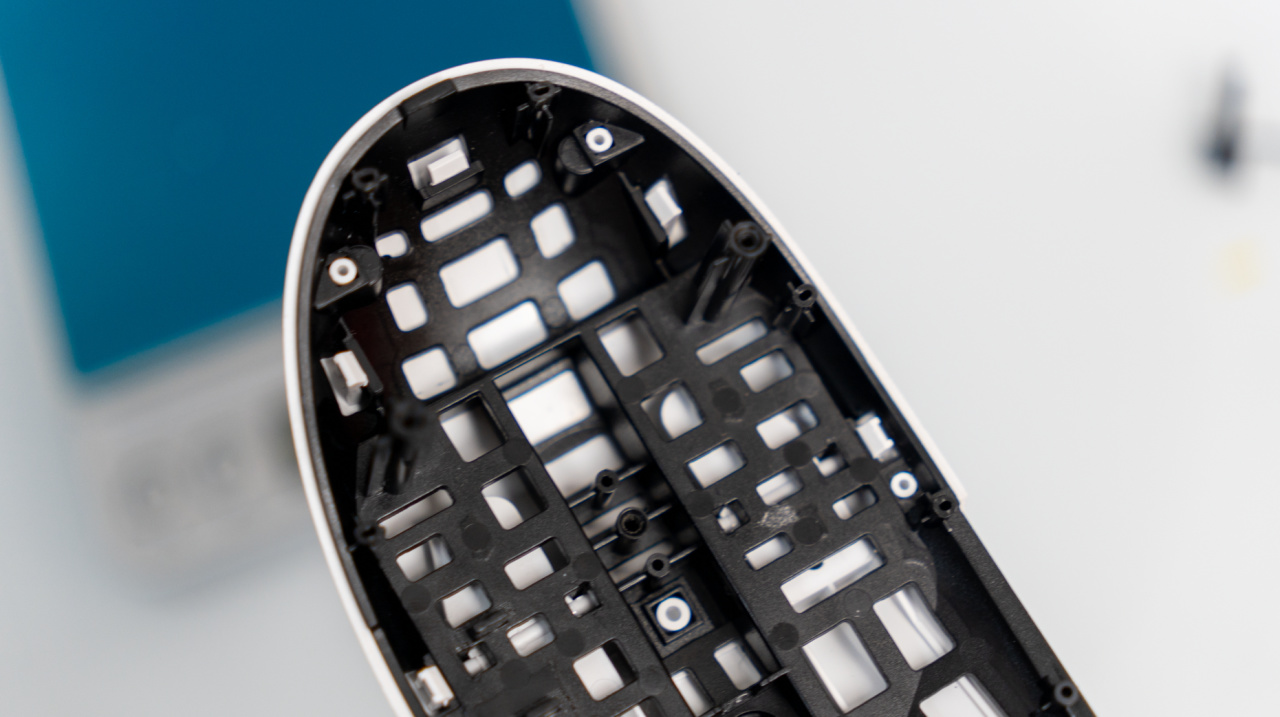 先来看上边,这次上边可以看到由两部分组成,把电池取下来后可以看到这块中框,或者说内框上有大量的减重孔。DPI按键通过螺丝固定,后壳则是通过卡扣固定。