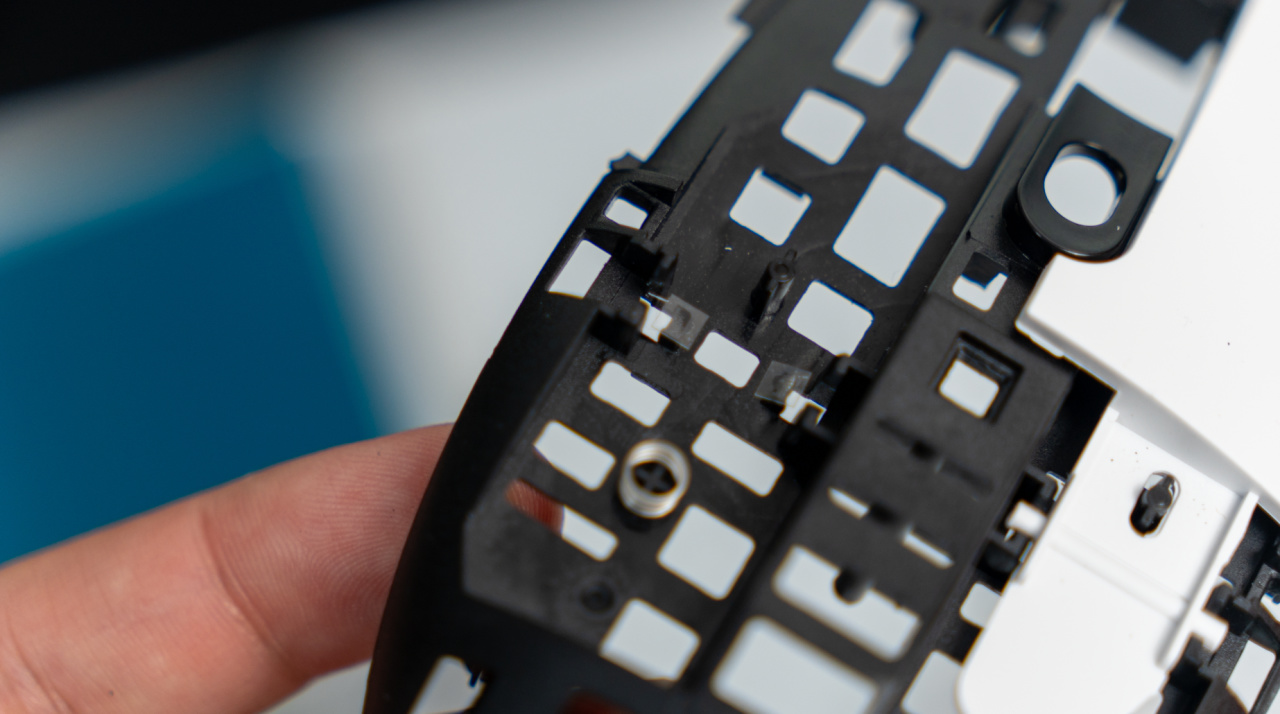 侧键微动通过底壳上的卡槽卡住,是华诺白点微动,侧键则是通过一颗螺丝,固定在这个一体注塑的底壳上。
