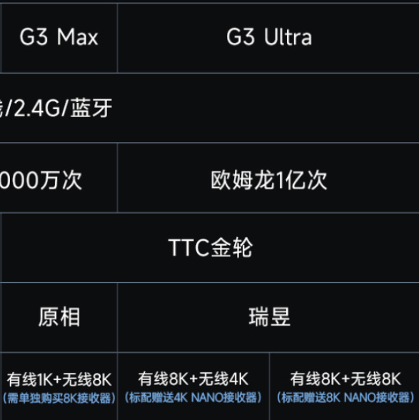 G3 Ultra的无线主控升级到了瑞昱,回报率方面分为有线8Khz+无线4Khz和有线8Khz+无线8Khz两种回报率可选,虽然高回报率也需要后续购买,但这次618首发阶段G3 Ultra会赠送高回报率接收器。