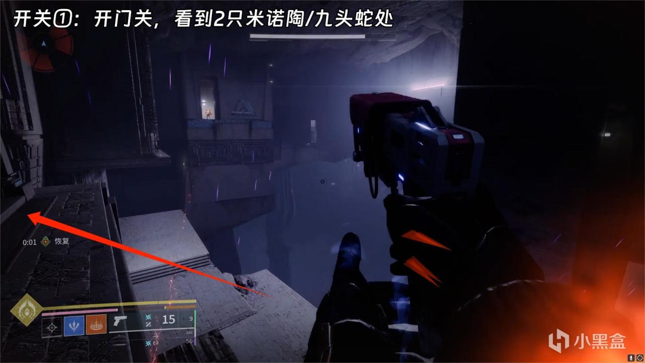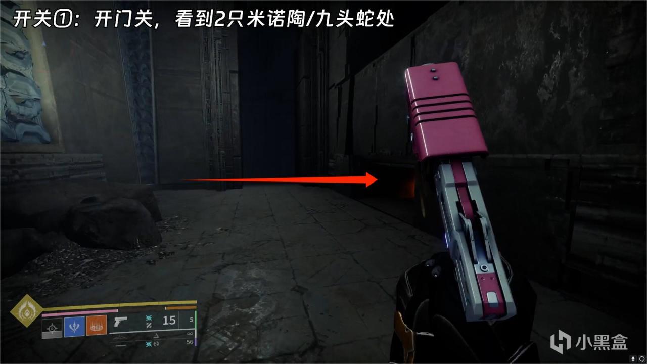 - 看到2只米諾陶處(頭頂會刷九頭蛇),跳到左邊的高臺上,再跳到對面房間裏,往下跳,側面有個小窗口,進去就是第一組開關