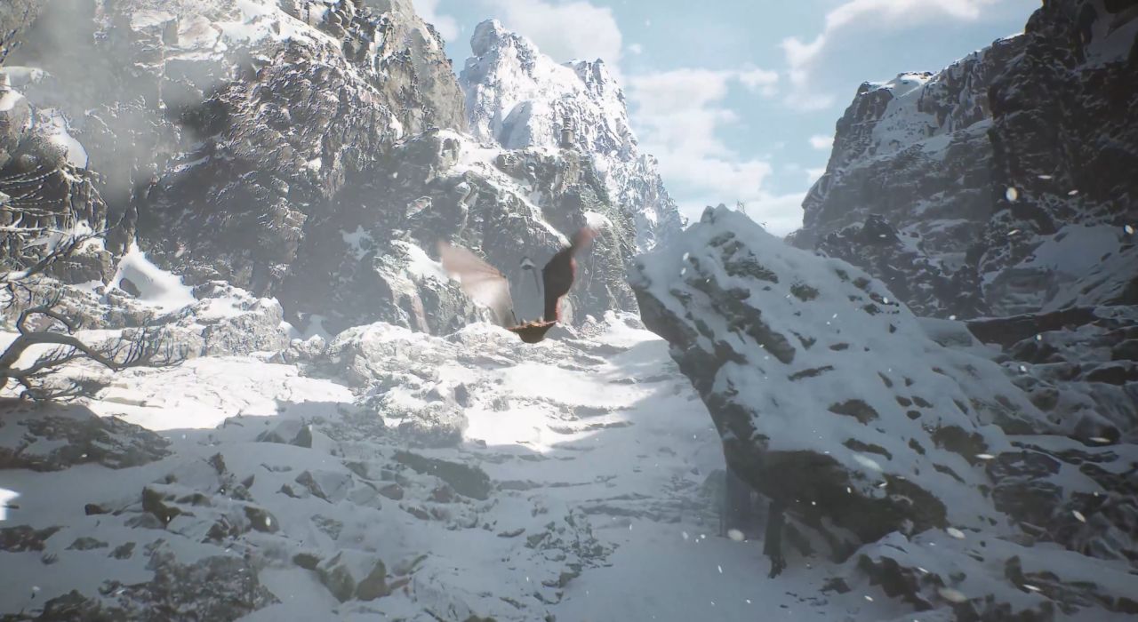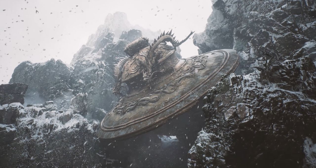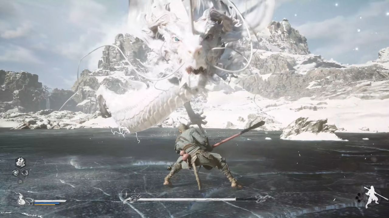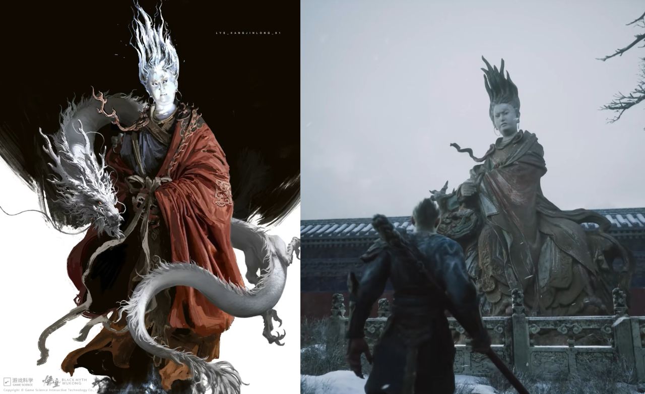天命人變成蝙蝠,跟隨小西天土地穿山越嶺後來到一片開闊冰面,冰面上有巨龍盤旋,巨龍頭上長有尖角。結合官方披露的原畫和建模原型可知,冰面上盤旋的正是亢金龍。
