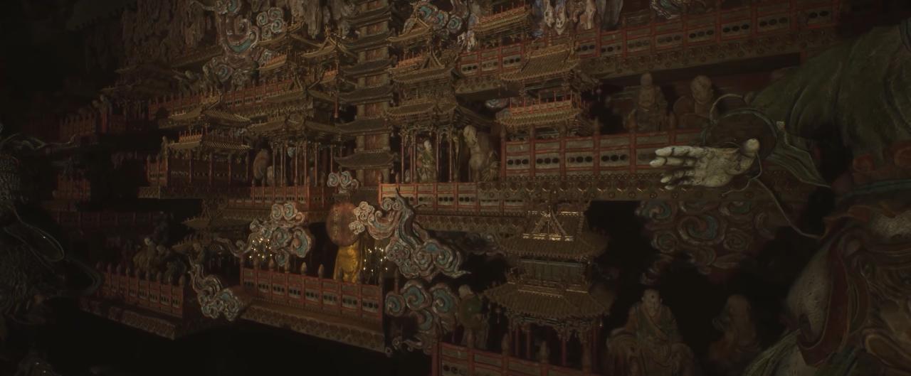 視頻中除了亢金龍,另一個比較明確的場景就是天命人進入寺廟的大殿,大殿中有一個各種佛祖、菩薩、金剛等形象的巨大壁畫。仔細觀望才發現,這壁畫上的形象竟然是活的。並且可聽到私語切切,嘲笑着天命人相貌醜陋。雀喧鳩聚,絲毫沒有佛堂大殿的莊嚴與肅穆。