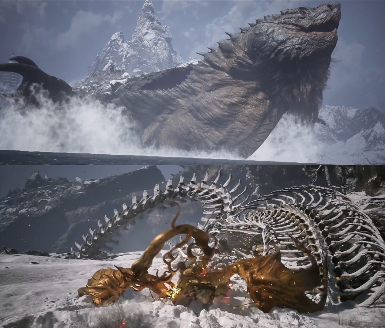 天命人與怪物纏鬥,背景中出現巨大蛇/龍形生物的遺骸。結合同場景中出現的巨大龜形生物,有人覺得可能是猴哥第二次搬的救兵-真武大帝座下的水火龜蛇二將。但是爲什麼龜在蛇死?龜蛇二將爲什麼也出現在小西天?是否有可能是當時與龜蛇二將同行的五大神龍之一?
