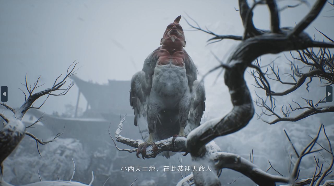 背景中的小西天皚白雪,一片蕭瑟與衰敗的景象,樹木凋殘,看不見一絲綠意。不知是否因小西天山高又正值隆冬,又或者天地異變導致?我們先不去提。天命人遇到一隻鳥身人首的生物,自稱小西天土地公。